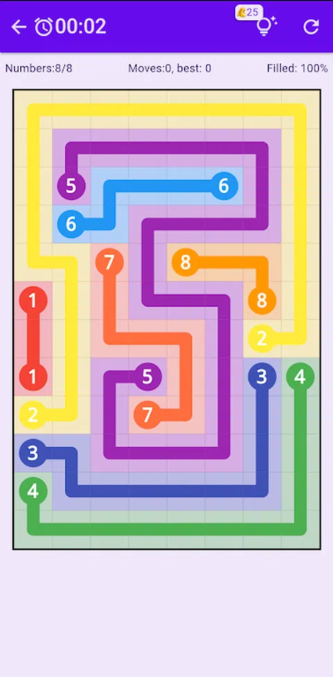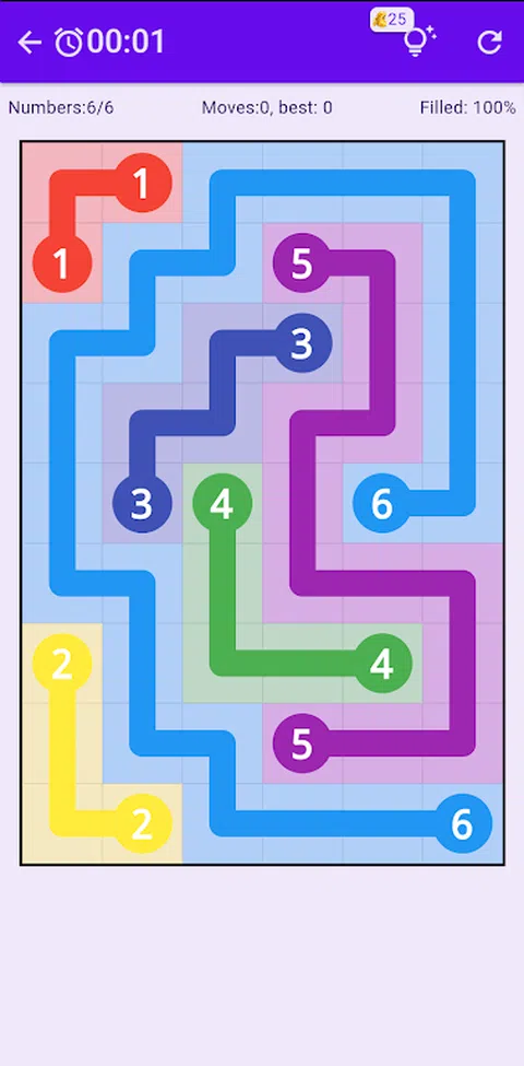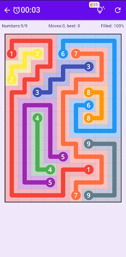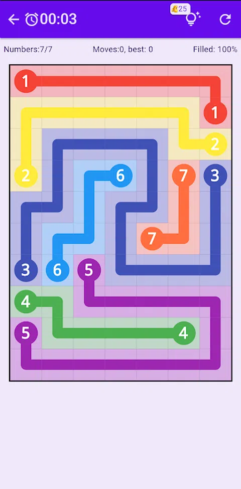 用连续线连接每对数字。在单元格中水平或垂直移动。必须使用网格中的所有单元格。 游戏规则 ★ 每个数字都必须通过不间断和未分裂的路径连接到其匹配的伙伴。 ★ 任何路径都不得越过另一条路径或折回自身。 ★ 网格上的每个方块都必须用一种颜色填充。 特点: ★ 每月更新拼图 ★ 多种尺寸,从 6x6 到 11x16 ★ 提示 没有万无一失的逻辑方法来解决这个看似简单的难题。或者,正如尼科利所说,“拼图需要启发性的猜测和令人费解的感觉