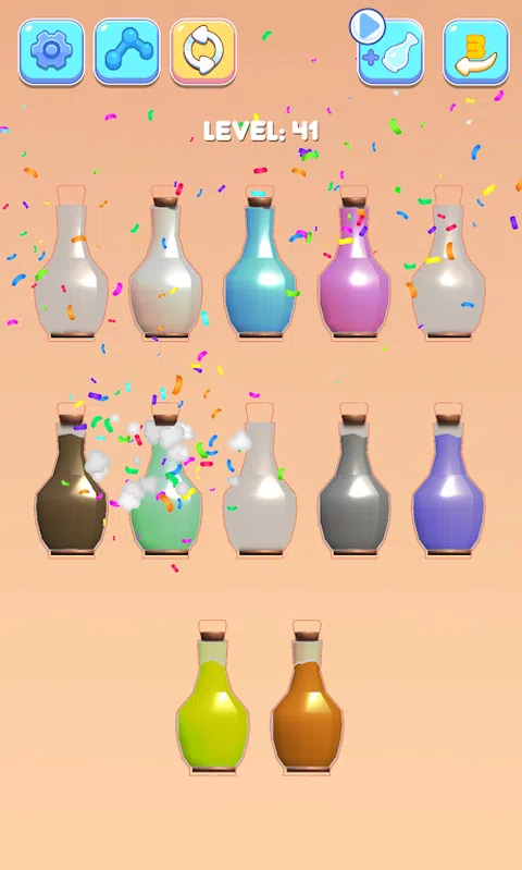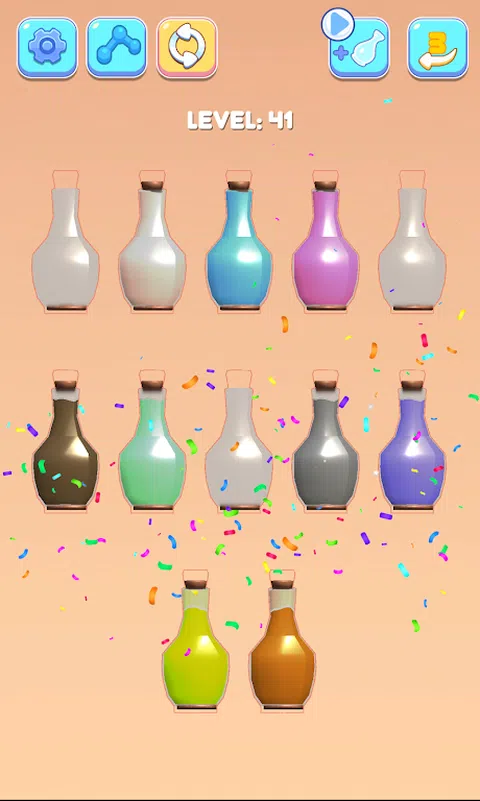 液体分类:彩色 3D 拼图是一款有趣且令人上瘾的水分类益智游戏!尝试对玻璃杯中的有色水进行分类,直到所有颜色都在同一玻璃杯中。一款具有挑战性而又令人放松的水上游戏,可以锻炼您的大脑! 尝试将其分类并将彩色水倒入瓶子中,直到所有颜色都在同一个水瓶中。一款轻松而具有挑战性的水类益智 3D 游戏,可训练您的大脑 怎么玩 • 点击任何玻璃瓶,将有色水倒入另一个玻璃瓶,使玻璃充满颜色。 • 规则是,只有当水连接到相同的颜色并且玻璃上有足够的空间时,您才能倒水。尝试对玻璃杯中的有色水进行分类,直到所有颜色都在同一玻璃杯中。 • 尽量不要卡住 - 但不要担心,您可以随时重新启动关卡。 特色 休闲颜色分类游戏 - 无论年龄或性别,都可以享受颜色分类游戏 简单有趣的水排序益智游戏 - 游戏方法简单,倒彩色水感觉很有趣。 数以百计的水上拼图挑战关卡! - 多个独特的关卡:可以免费享受水分类挑战和令人兴奋的关卡,以进行分类和填充。 没有时间限制! - 没有处罚和时间限制;您可以按照自己的节奏享受 Water Sort:3D 液体拼图! 无需 Wi-Fi