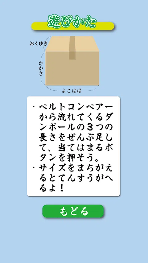 “Genkidama!基于SDGs的治疗游戏项目”为发育障碍儿童(自闭症、阿斯伯格综合症、注意力缺陷/多动障碍(ADHD)、学习障碍和抽动障碍)开发治疗和教育游戏应用程序。 这是一款专为残疾儿童设计的简单游戏应用程序。 ◆《Hisatsu Assorter!》的规则超级简单◆ 一个简单的游戏,您可以将快递递送的包裹的宽度、高度和深度数量相加,计算总数,然后对包裹进行排序! 将来自传送带的纸板箱的所有三个长度相加,然后点击按钮选择与总数相匹配的数字。 如果您输入错误的尺码号码,您的积分将会减少。 您可以从“简单”、“稍难”和“非常困难”中选择游戏的难度级别。 随着难度的增加,行李的尺寸也随之增加,计算的总价值也随之增加。 选择适合你的难度,正确计算你的行李总价值,力争通关游戏,获得最高分
