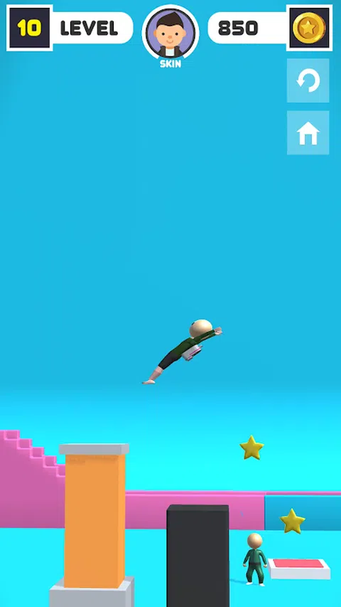 我们的主角站在高台上,已经做好后空翻的准备。按住屏幕调整角度,松手后即后跃到空中。在空中,点击屏幕,或轻点,或长按,调整身体角度,我们的目的是让主角双脚落到目的地,否则游戏失败。非常有挑战的游戏,来试试你能玩到第几关