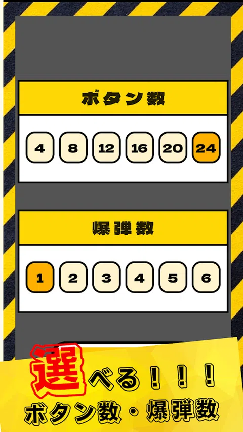 任何人都可以玩的简单操作的炸弹迷你游戏 一款非常适合与惩罚游戏战斗的便捷游戏! [炸弹开关] 只需选择按钮和炸弹数量,然后按下开关! 获胜只需要运气! 【早推阿弥陀寺】 选择按钮以避免被炸弹击中 按钮先到先得! 你谨慎吗? ?迅速? ? 【一颗定时炸弹】 选择时间开始吧! 限时一到,必爆! 尽量避免在智能手机爆炸前转动它