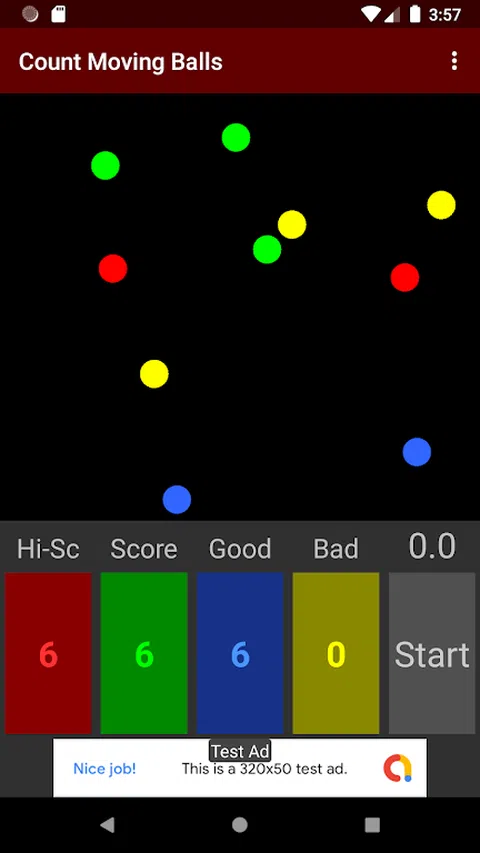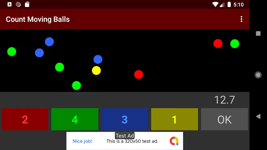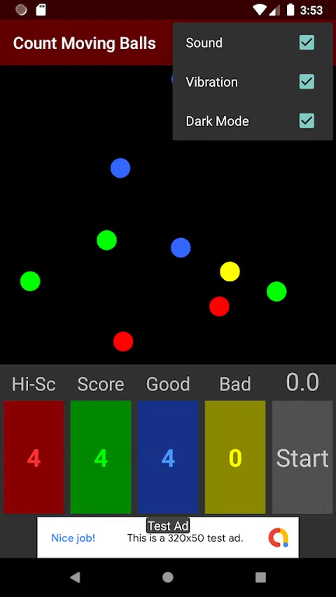 这是一款通过计算每种颜色不断移动的球的数量来训练您的动态视力和大脑的游戏。 通过点击与球相同颜色的数字,数字将增加一。 当每个数字与该颜色的球数相同时,点击“确定”按钮。 分数取决于您在 30 秒内获得多少正确答案。 如果答案不正确,分数将减少。 您可以通过取消选中菜单项中的“声音”来关闭声音。 您可以通过取消选中菜单项中的“振动”来关闭振动。 似乎有时间限制的大脑训练可以通过意识到快速回答来使大脑更加活跃