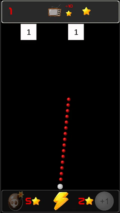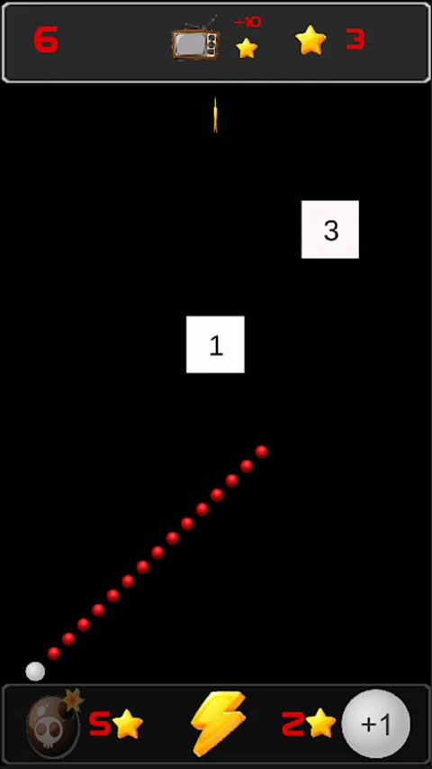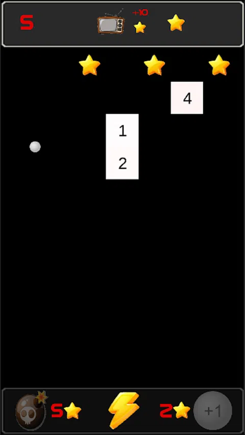 触摸屏幕,向下滑动,抓住目标并释放球。 游戏从1个球开始。 每次触摸方块都会下降。 您可以用2星将球的数量增加1。 您可以摧毁最近的 5 星方块。 在球运行时按下按钮,否则方块会向下移动