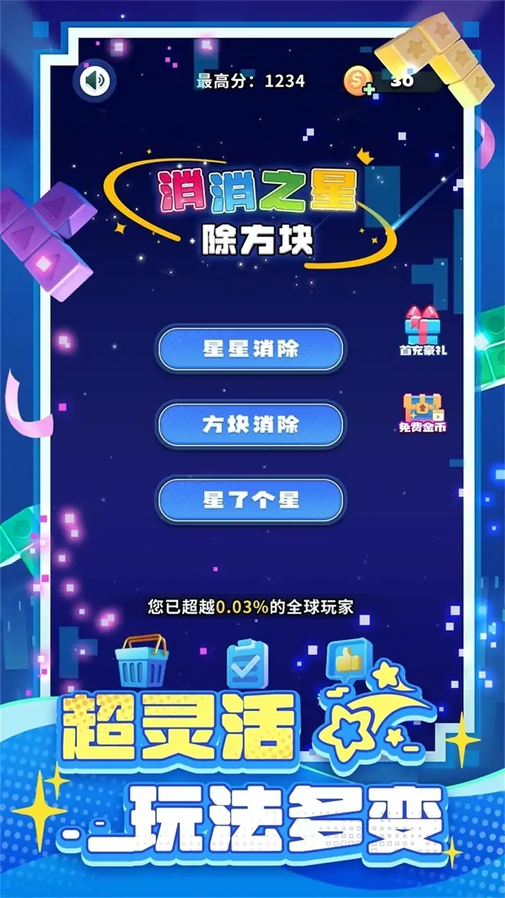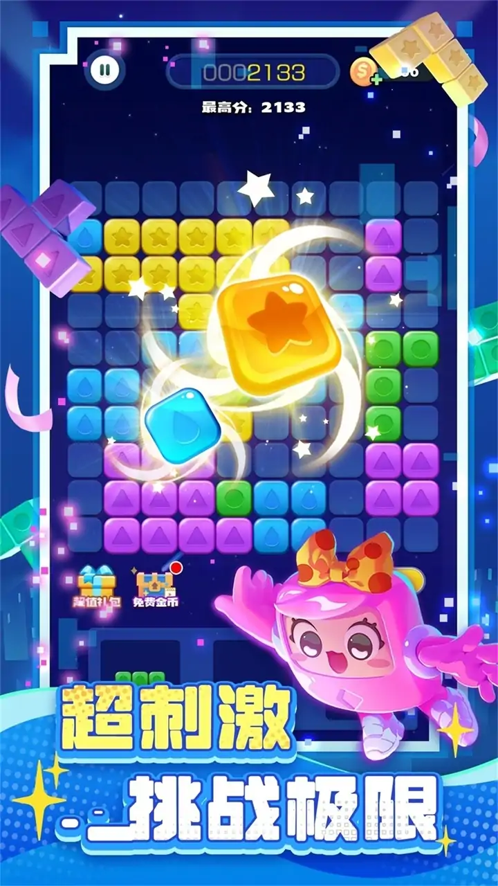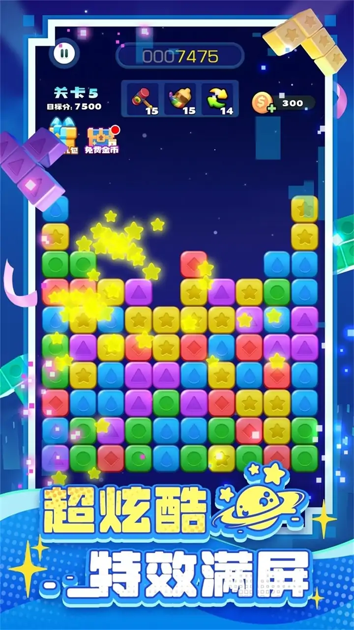 全新消除游戏,经典传奇重现! 多种玩法融入,更多消除乐趣 畅爽消除体验,最原始的快乐 完美消除手感,原汁原味体验 《消消之星除方块》是一款以消除彩色方块为主题的休闲益智点击消除游戏。游戏提供了无尽的关卡供玩家挑战,每次开始游戏都是全新的挑战旅程,过关后分数不会清零,随着关卡的提升,关卡目标分数不断上涨,打好基础很重要。每个关卡完全随机,运气也是重要的一环,不到最后绝对不要放弃!游戏中还提供了强大的道具供玩家使用,巧妙的运用道具可能会带来意想不到的收获,极大地增加了游戏的趣味性的同时还增加了游戏的策略性。 作为一款益智休闲游戏,为玩家打造色彩丰富的魔幻世界的同时,让玩家在思考消除顺序以及道具的使用可能产生的各种效果时能一定程度的锻炼思维和逻辑性,在玩家不断挑战高分,超越自我极限的过程中,为玩家提供一个轻松休闲、趣味解压、益智健脑的娱乐途径。 ◆无关卡限制,随时自动保存进度 ◆多种强力道具,助你挑战新纪录 ◆全新重置画面,给你精美轻松消除 ◆多种玩法加入,随时选择你喜欢的模式
