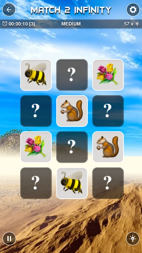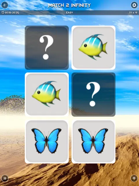 每天玩“Match 2 Infinity”,磨砺您的思维并训练您的记忆力。 “Match 2 Infinity”是一款基于传统寻找配对棋盘游戏的经典记忆游戏。 “Match 2 Infinity”是一款出色的匹配游戏,具有精美的图像和用户友好的设计。 它有助于提高您的准确性,提高速度,训练您的大脑,快速反应和注意力。 有5个不同的难度级别,从“简单”到“大师”。 特点: ◉有无限的谜题
