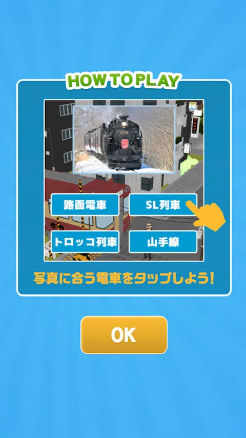 你知道多少种火车类型? 在玩游戏的同时了解火车的乐趣! 玩起来非常简单! 只需找到与您的主题相匹配的火车并点击它即可! 任何人都可以轻松玩! 出发进度!