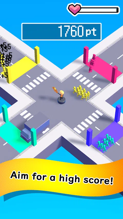 在十字路口控制交通。 引导行人安全! 控件很简单!只需朝您希望人们去的方向滑动即可!使用颜色来帮助您决定引导它们的方向。 注意不要将行人引向错误的方向,也不要让他们被汽车撞到,否则您的生命值会受到影响
