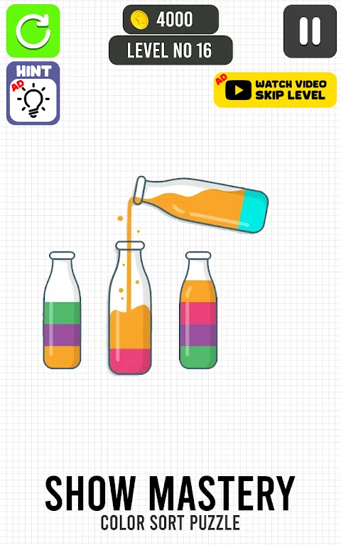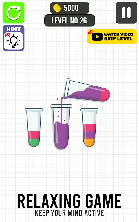 Fill the Glass 是一款有趣且具有挑战性的画线益智游戏,将测试您的问题解决和战略思维能力。填满玻璃游戏的目标很简单:使用绘制线自由地避开每个级别中提供的障碍,用水填充空玻璃。该游戏提供了基于物理原理的填色游戏和脑筋急转弯益智水上游戏的令人愉悦的组合,让玩家保持数小时的参与和娱乐。Line Fill the Glass 是一款引人入胜且具有挑战性的水上益智游戏,要求玩家有策略地绘制线条,以将其装满一个快乐的玻璃杯。我们的目标是在快乐游戏中仔细规划和绘制 3D 线,引导液体流动以填充玻璃,而不会洒出快乐杯子填充物。随着铅笔游戏难度逐渐增加,快乐游戏中的各种障碍,玩家必须使用他们的问题解决技巧来完成每个阶段的填充玻璃水。 水彩分类是一款令人上瘾且视觉上引人入胜的颜色分类益智游戏,它将测试您的颜色分类和水彩分类技能。沉浸在充满活力的水上益智游戏和液体分类益智挑战关卡的世界中,努力按各自的色管对颜色进行排列和分类。通过简单而引人入胜的颜色排序游戏玩法,排序水彩拼图为所有年龄段的玩家提供数小时的娱乐。|Color Sort Game 是一款有趣且令人上瘾的水上益智游戏,挑战玩家将各种液体分类彩色物体分类到各自的彩色水分类容器中。游戏的目标是使用有限的资源或动作,有策略地排列彩色管,以成功完成每个水分类谜题级别。瓶子游戏简单的概念和日益复杂的挑战使其适合所有年龄段的玩家,从休闲游戏玩家到拼图爱好者。 - 动态机制。自由画线以完成关卡! - 简单、智能、有趣的谜题,但也可能具有挑战性 - 众多关卡,更多关卡即将推出