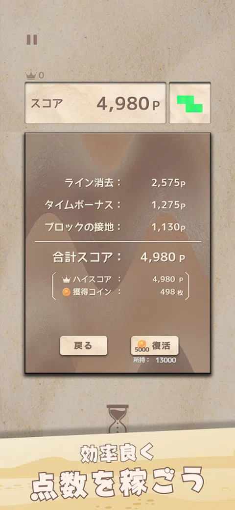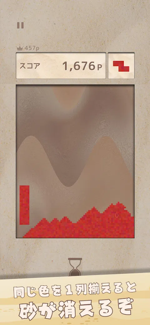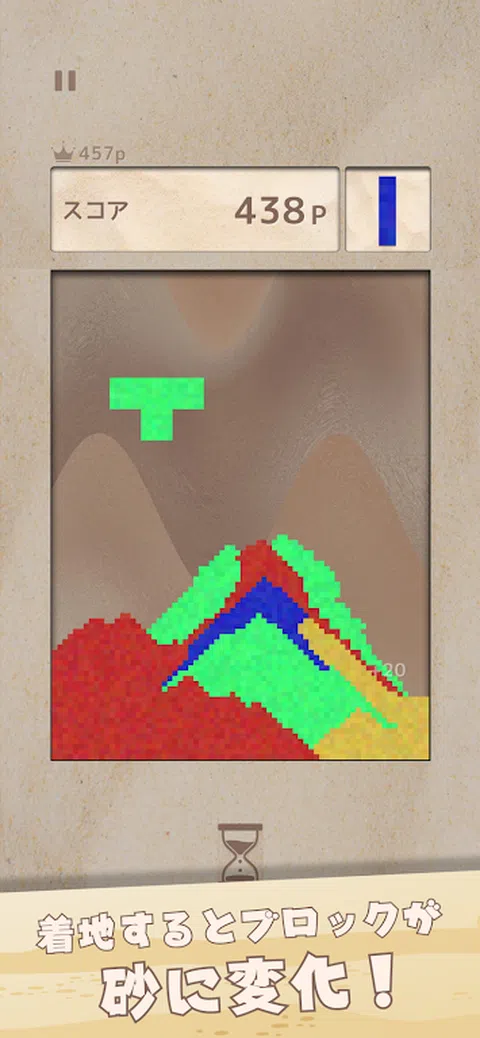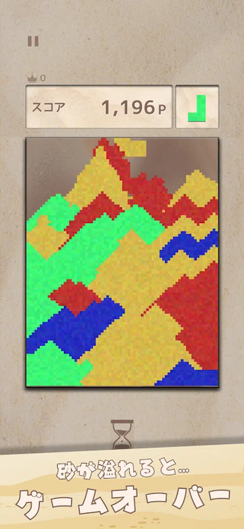 \新感觉益智游戏/ 这是一款新型益智游戏,您可以控制掉落时变成沙子的方块来消除相同颜色的沙线。 【游戏内容】 ■概要■ - 如果掉落的方块接触到平台,它就会碎成沙子。 - 如果将相同颜色的沙子从右端到左端排列,该沙子将被擦除并添加分数。 - 玩家应该以更高的分数为目标! ■游戏结束条件■ 当沙子升到屏幕上时,游戏就结束了。 ■策略■ ・擦掉沙子上的线条越多,获得的分数就越多。 - 每20秒就会增加一次时间奖励。这次奖金会随着时间的推移而增加。 能否获得高分的关键在于你能否长时间生存并高效消除线条。