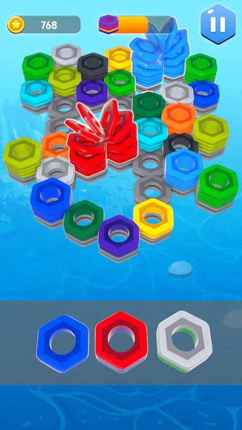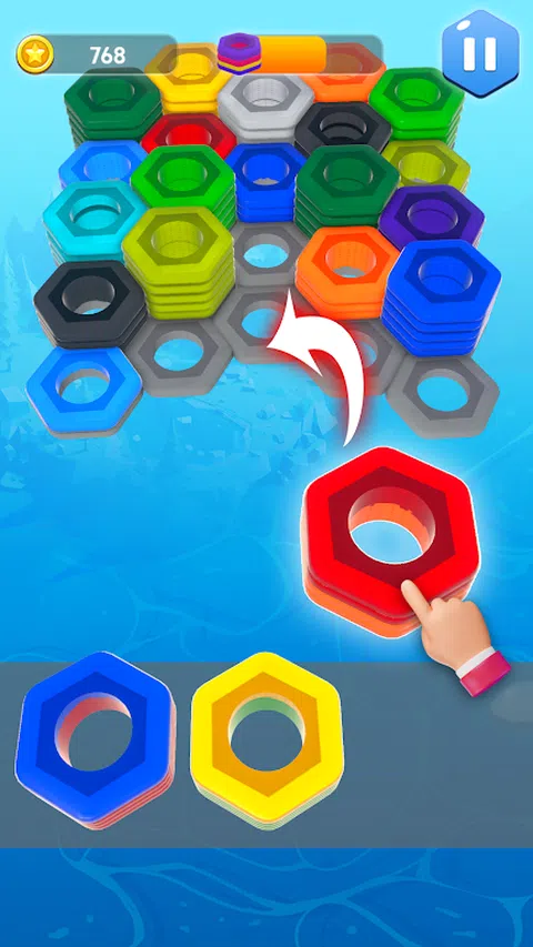让我们准备用你的大脑在这个螺母和螺栓游戏中解决相同颜色的 3d 螺母。 将正确的六角块放在正确的位置以合并和解决超级六角形木螺母。有许多螺丝排序块准备测试你的智商现在由你来解决螺母拼图谜题。所有螺母块都有独特的颜色和位置。在触摸任何彩色排序块之前先绘制拼图图,因为错误的手指移动会使这个简单的螺丝拼图变成一个棘手的拼图游戏。用你的大脑在这个轻松的益智游戏中玩经典比赛 如何玩; 六角 3d 拼图是一种具有挑战性的游戏,有多种颜色的螺母。洗牌以组织相同的颜色并得分以解决相同颜色的螺母。用你的手指滑动颜色匹配的六角形螺母并将它们放在一个空的颜色托盘中。逐个解锁新挑战并在完成阶段后获得奖励。在卡住之前将正确颜色的螺母放在正确的位置。使用多种救援选项在困难情况下重置您的游戏。 寻找合适的地方放下积木。 hexa 3d 坚果游戏是一款出色且具有挑战性的分类游戏,具有扭曲的拼图挑战。丰富多彩的环境和艺术性的分类、游戏玩法挑战使这款游戏适合所有人