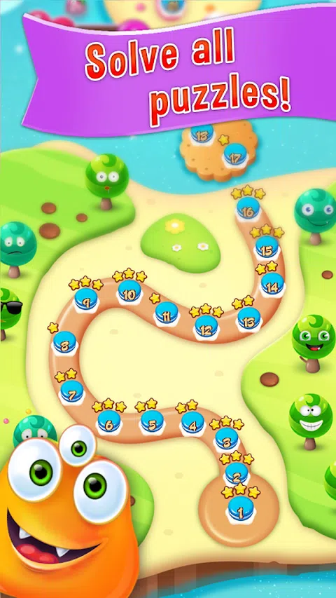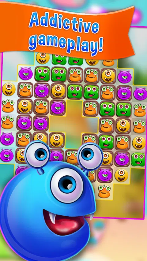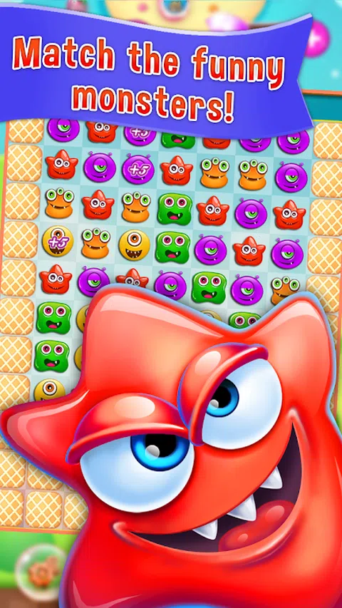 怪物爆炸是一款免费的三消益智游戏。通过交换游戏面板上的彩色怪物碎片,使三个或更多相同颜色的匹配,完成关卡,从面板上消除那些糖果并用新糖果替换它们,这可能会创造更多的匹配。四个或更多怪物的匹配会创建独特的怪物,这些怪物充当具有更大面板清除能力的增强器。棋盘有各种目标,必须在固定的移动次数或有限的时间内完成,例如达到一定分数或收集特定数量的某种怪物