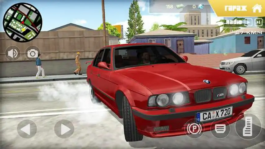 一款关于宝马E34汽车的游戏是一款GTA风格的大型开放城市的汽车模拟器。沿着圣安德烈亚斯熟悉的街道漫步 - 您可以驾驶汽车绕城游览并下车,也可以打开车门、后备箱和引擎盖。