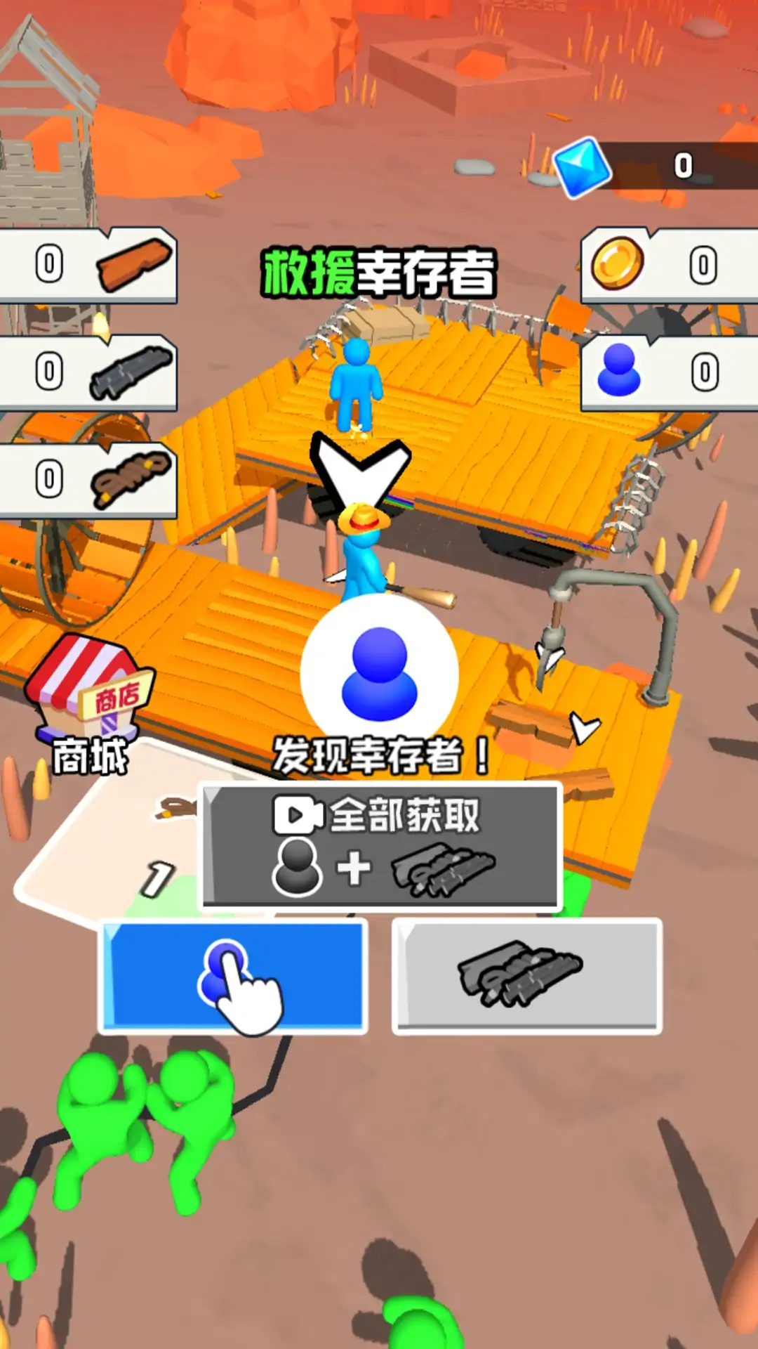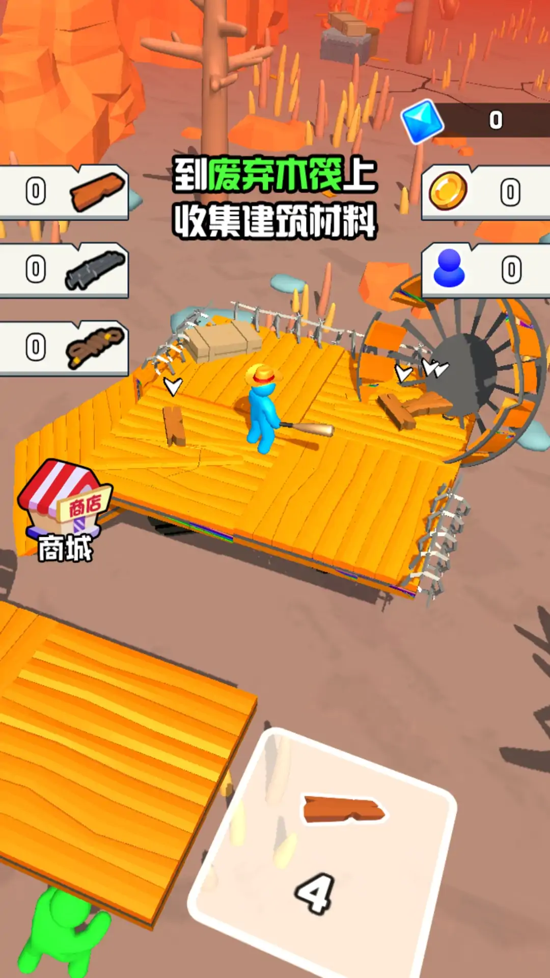 在游戏中,玩家需要操控一名蓝色小人,收集各种各样的建筑材料,用来建造自己的木筏,让木筏拥有更多的功能,还要时刻注意路上的僵尸,防止他们爬到你的木筏上,营救更多的幸存者,并成功呼叫救援直升机逃脱,获得游戏胜利。