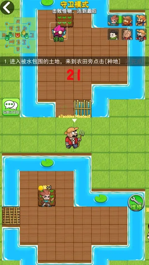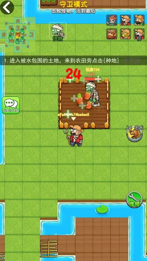 是时候关灯了。凶猛的鬼看门人闯进了宿舍楼! “嘭。嘭。嘭。”愤怒的鬼魂无情地攻击宿舍门。 赶紧躲到床上,建立起你们的设施和防御,一起抵御鬼魂吧! 玩家可以选择扮演农民或僵尸入侵者。 作为农民,你可以种植农作物,建造植物大炮,升级大门,防御僵尸和怪物的入侵。 作为入侵者,当倒计时结束时,你对农作物发起入侵,突破农民的防御