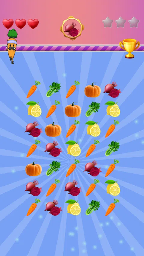 Veggies Crush 是一款流行的匹配 3 游戏,玩家必须通过连续匹配三个或更多相同类型的蔬菜来从网格中移除蔬菜。凭借丰富多彩的图形和令人上瘾的游戏玩法,难怪这款游戏容易匹配 3。 在“Veggies Crush”中,玩家必须使用策略和快速思维来清除蔬菜。游戏在一个充满各种蔬菜的网格上进行,目标是连续匹配三个或更多相同类型的蔬菜,将它们从面板上移除。玩家可以交换相邻的蔬菜以创建匹配的集合,他们在一次移动中清除的蔬菜越多,他们获得的积分就越多。 随着玩家的进步,游戏的不同阶段都会获得星星。每次游戏开始时都会引入新型蔬菜。有些蔬菜更难匹配,有些则需要移除多个匹配项。玩家必须使用所有技能和策略来克服这些挑战,才能获得三颗星。 还可以通过匹配金环中所需的蔬菜来帮助胡萝卜赢得奖杯。 《Veggies Crush》如此有趣的原因之一是成功匹配带来的满足感。游戏丰富多彩的图形和新鲜蔬菜增添了吸引力,简单的游戏玩法很容易上手,但具有挑战性主人。 总体而言,“Veggies Crush”是一款有趣且令人上瘾的匹配 3 游戏,非常适合所有年龄段的玩家。无论您是经验丰富的游戏玩家还是该类型的新手,您都一定会找到喜欢“Veggies Crush”的东西.”那为什么要等待?下载游戏并立即开始匹配这些水果