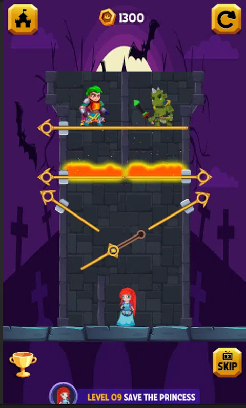 令人上瘾和具有挑战性的益智英雄冒险,具有简单有趣的游戏玩法,将吸引所有年龄段的玩家。一款可以真正测试智商的游戏。 游戏将带您进入中世纪,在那里玩家被代表为一个年轻的王子,他必须解决困难的谜题以拯救公主,收集金币,杀死地精等等。 拉动销钉,开辟通往英雄的安全路径。成为你王国的英雄。超过 100 个难度级别等着你。拉动销钉以杀死妖精,拯救公主,获得百宝箱等。 不要触摸熔岩,否则你会死