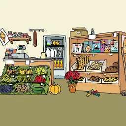 在商店中设置的点击和拖动游戏。根据听音,确定正确的物体,并用手柄将其拖到篮子上