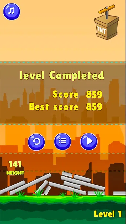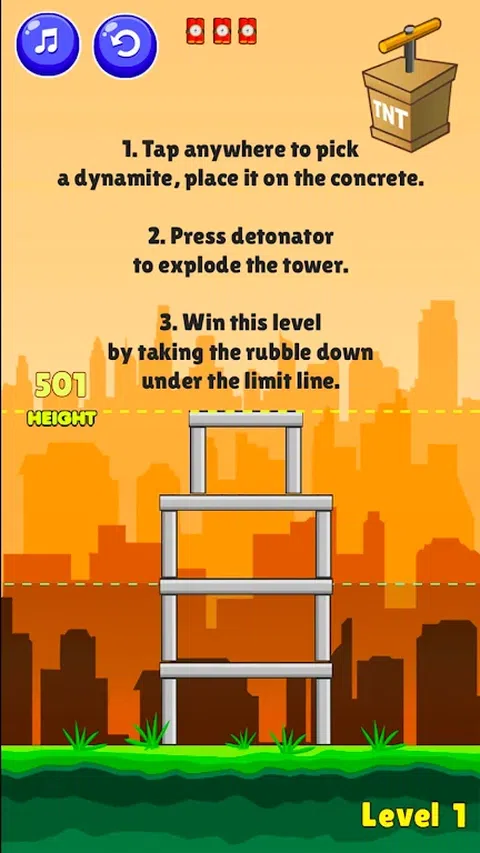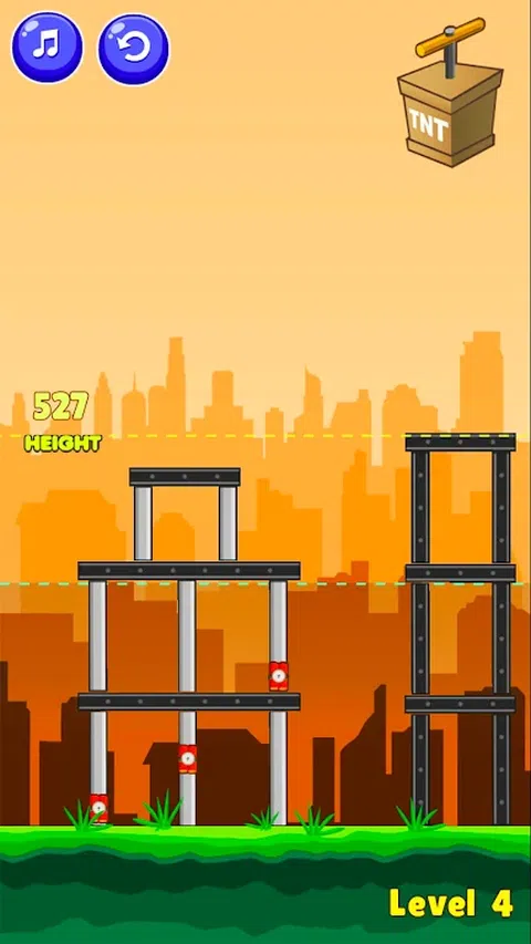 TNT 炸药 TNT 爆破是一款基于物理原理的益智游戏,您的任务是通过在混凝土结构上放置炸药来摧毁所有塔楼。 这种物理机制已经过增强,现在有 45 个级别,带来更逼真的体验。 怎么玩 单击屏幕上的任意位置以拾取炸药,将其放在混凝土上,按雷管以爆炸所有炸药。通过将瓦砾推倒在极限线以下来赢得每个级别。 特色: - 逼真的物理益智游戏 - 45 个具有挑战性的关卡 - 本地存储(保存关卡进度) - 有趣的游戏。非常容易上瘾。 如果您喜欢这个游戏,请享受并评价我们