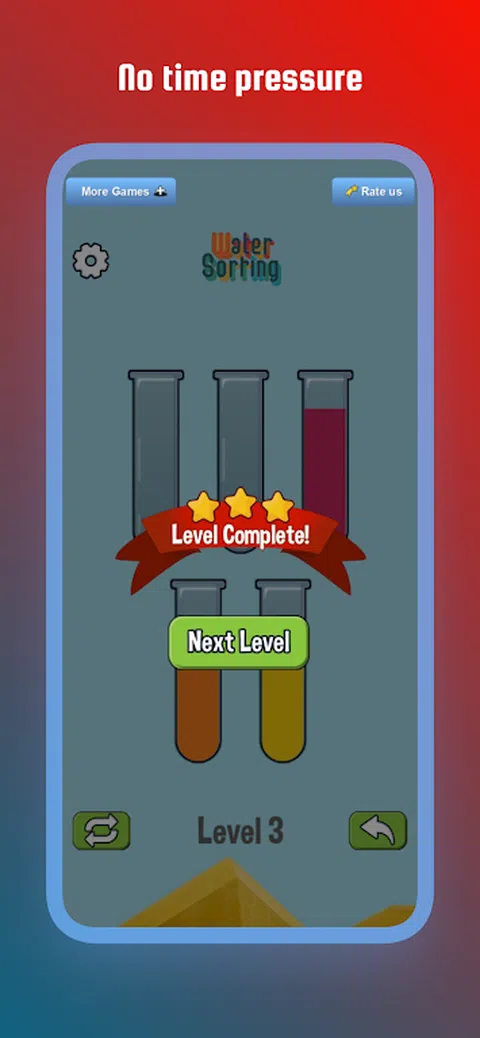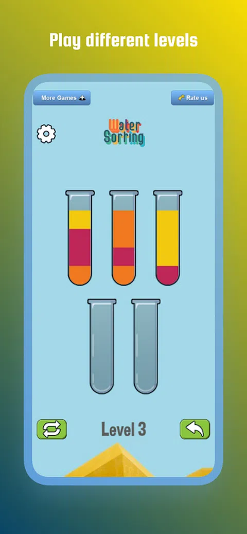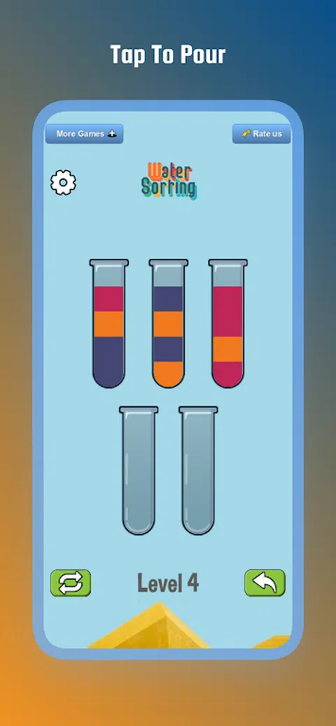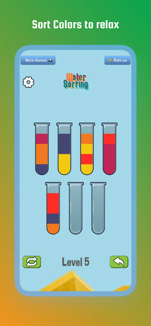 彩色水分类拼图是最有趣和最容易上瘾的倒水游戏之一!游戏中的任务是尝试对试管或玻璃杯中的水彩进行分类和分类,直到所有颜色都在同一个试管或玻璃杯中。倒水游戏始终在益智游戏类型中名列前茅。Color Water Sort Puzzle 以其经典的风格,一定会给您带来一个愉快的游戏,以及训练大脑的挑战和放松! 让自己沉浸在令人上瘾的水分类游戏中,并解决数千个具有挑战性的水分类关卡。沉浸在舒缓的水声中,倾倒并排列颜色,创造出美丽的色彩交响曲。让颜色流动并点燃您的兴奋! - 如何玩这个水排序 +先点击一个瓶子,然后点击另一个瓶子,将第一个瓶子中的水倒入第二个瓶子中。 +当两个瓶子的顶部有相同颜色的水并且有足够的空间可以倒入第二个瓶子时,您可以倒水分类。 + 每个瓶子只能装一定数量的彩色水。如果满了,就不能再往里面倒了。 +没有计时器,遇到困难随时可以重新开始。 没有处罚。只需放松并享受水分类拼图