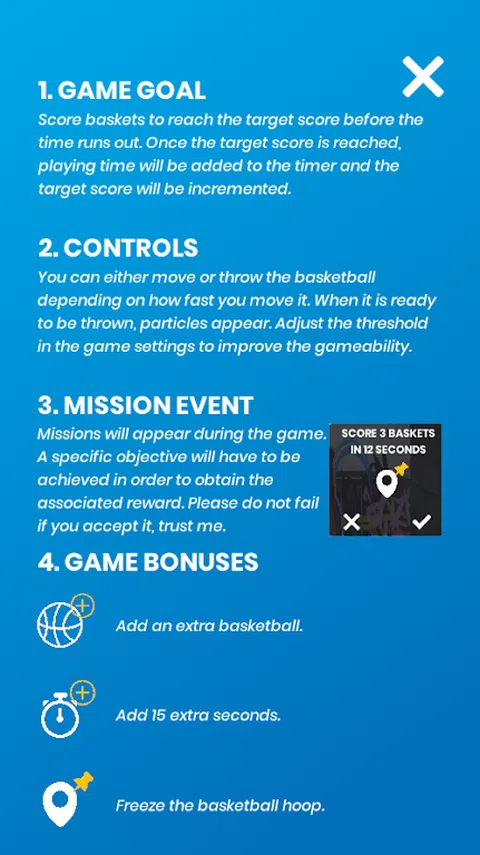 将篮球扔进篮子里,在时间用完之前得分。随着每个新级别,难度会增加,您必须在最短的时间内得分更多的篮子。此外,篮子将移动得更快。为了实现您的目标,我们将提供游戏奖励和特殊任务,但要注意失败的后果