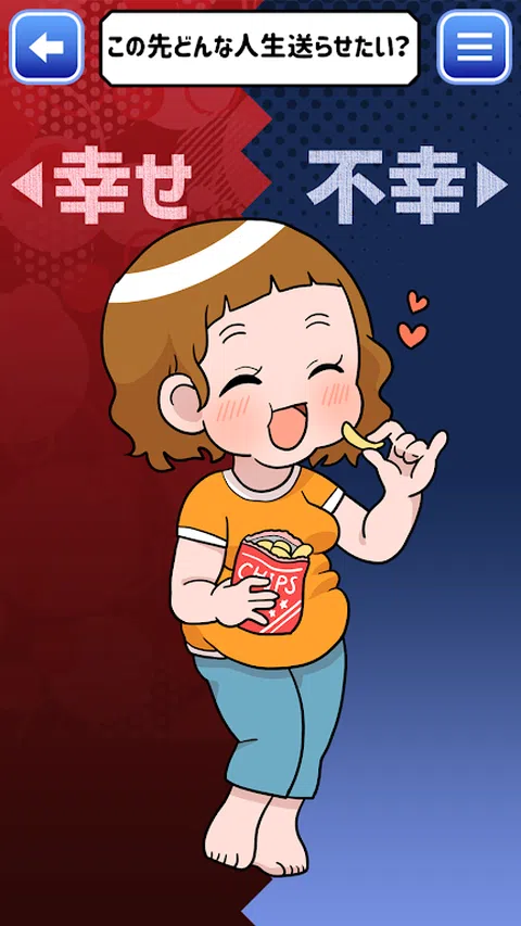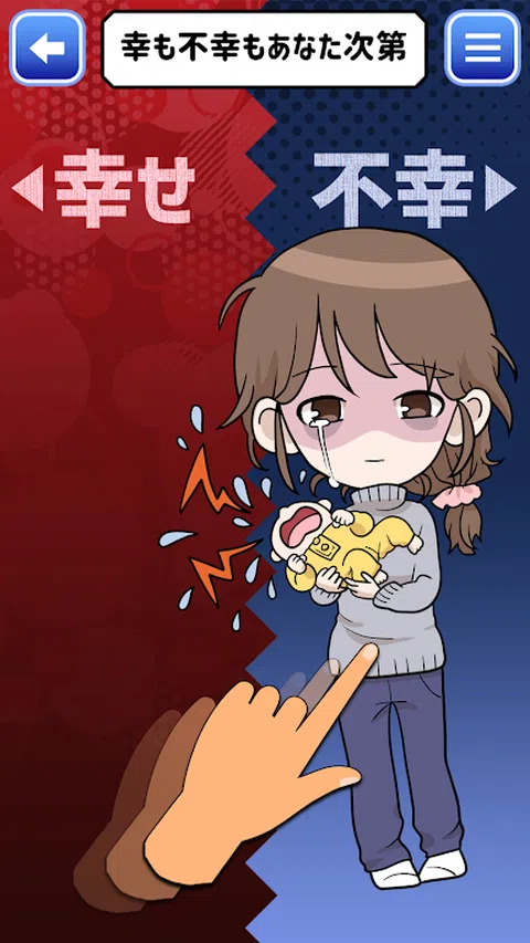 1. 找出你是一个什么样的人。 2. 滑动即可决定是否让幸福生活更进一步,还是因不幸而倒塌。 3.请亲眼看看这会导致什么样的结局。