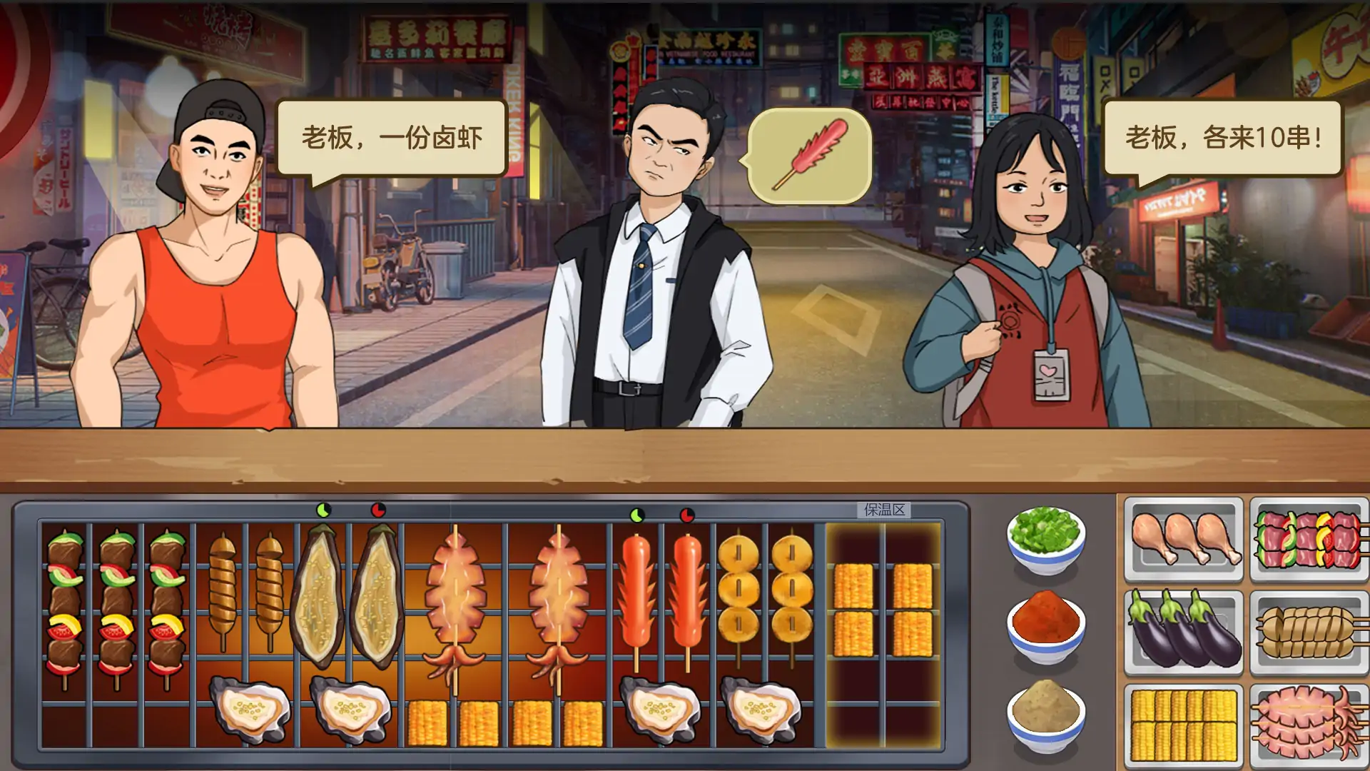 《我的大排档》是一款休闲模拟经营游戏,玩家可以在夜幕落下时分在夜市中经营自己的烧烤摊。游戏内存在大量性格各异,品位不同的客人,你需要尽可能的满足他们的要求,用各种烤串征服他们的味蕾。为了满足部分挑剔的顾客,注意随时补充自己的食材种类哦。
