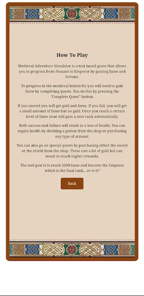 在《中世纪冒险模拟器》中,踏上穿越广阔奇幻世界的惊心动魄的身临其境的旅程。 在您的想象力的推动下,您将被运送到一个充满神秘和奇迹的王国。在一系列随机生成的任务中,与凶猛的怪物战斗,发现隐藏的宝藏,并解开这片迷人土地的秘密。 随着您的进步,您将从农民成为皇帝,甚至更多! 那你还在等什么?加入冒险,体验中世纪冒险模拟器