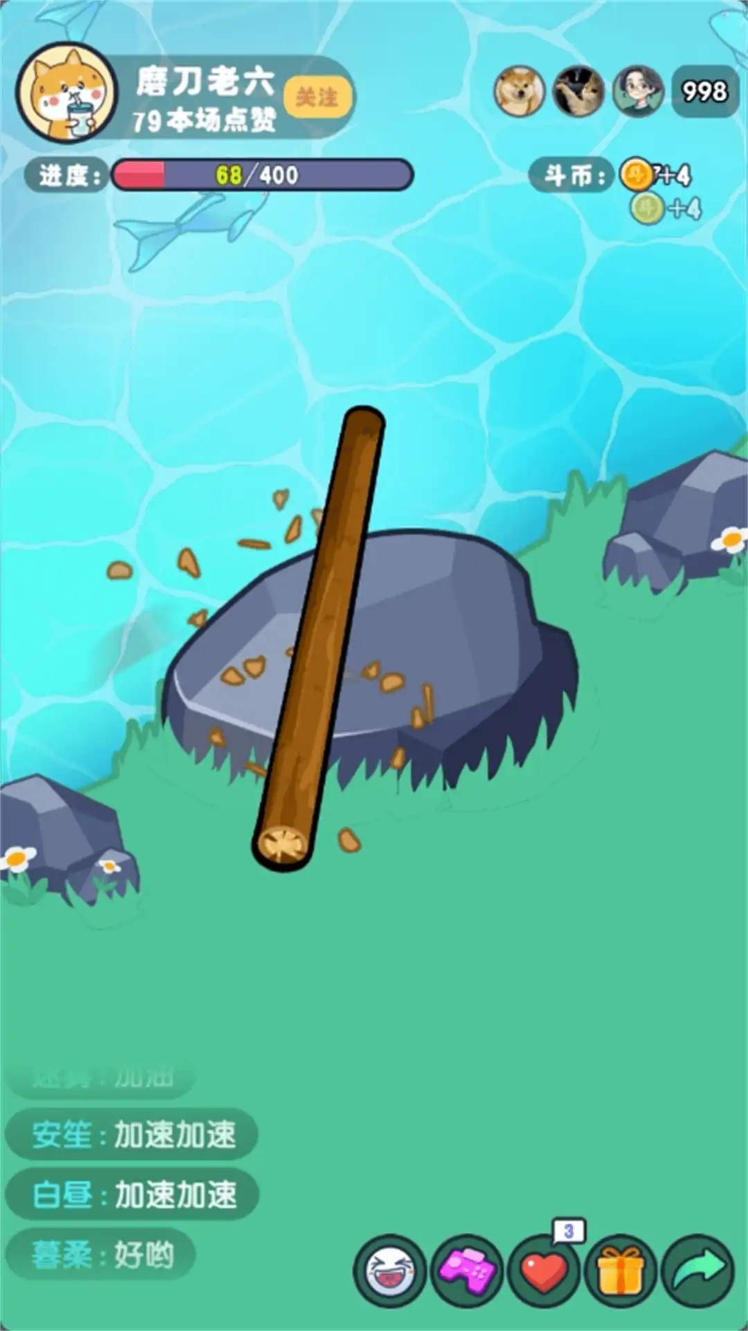 一款休闲类小游戏,游戏的核心玩法为模拟磨铁棒,玩家需要将各种材料的棒子在小河边的石头上磨成针,磨成针后,解锁下一个棒,不停的滑动屏幕直播磨成针吧,还能通过购买打赏各种礼物来增加磨成针的进度,搭配动听的音乐,还不来试试!