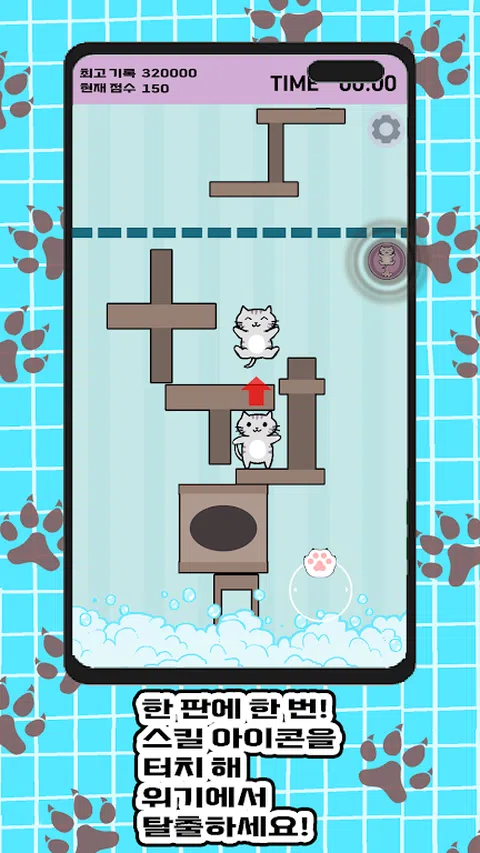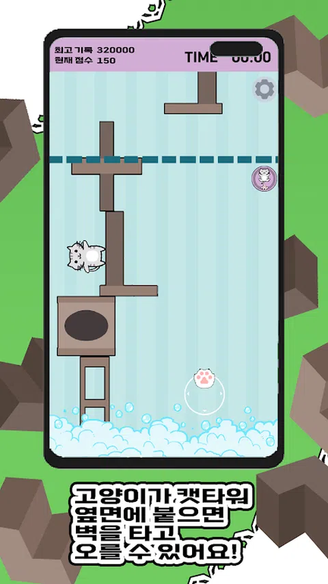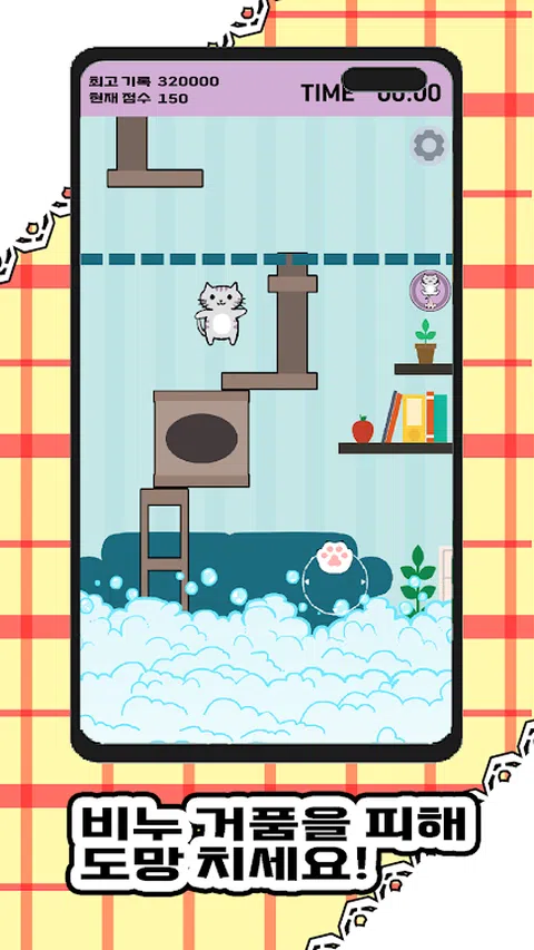 一只猫为了躲避主人洗澡而从猫塔上跑过, 从沐浴泡沫中逃脱,越过无尽的猫塔