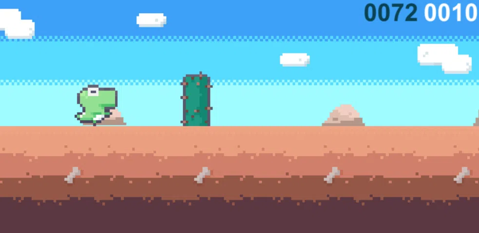 一只活着的恐龙向前移动。 有阻碍你前进的障碍。 通过触摸恐龙跳跃以避开障碍物并向目标点前进。你走得越远,你的分数就越高,分数越高,难度就越大
