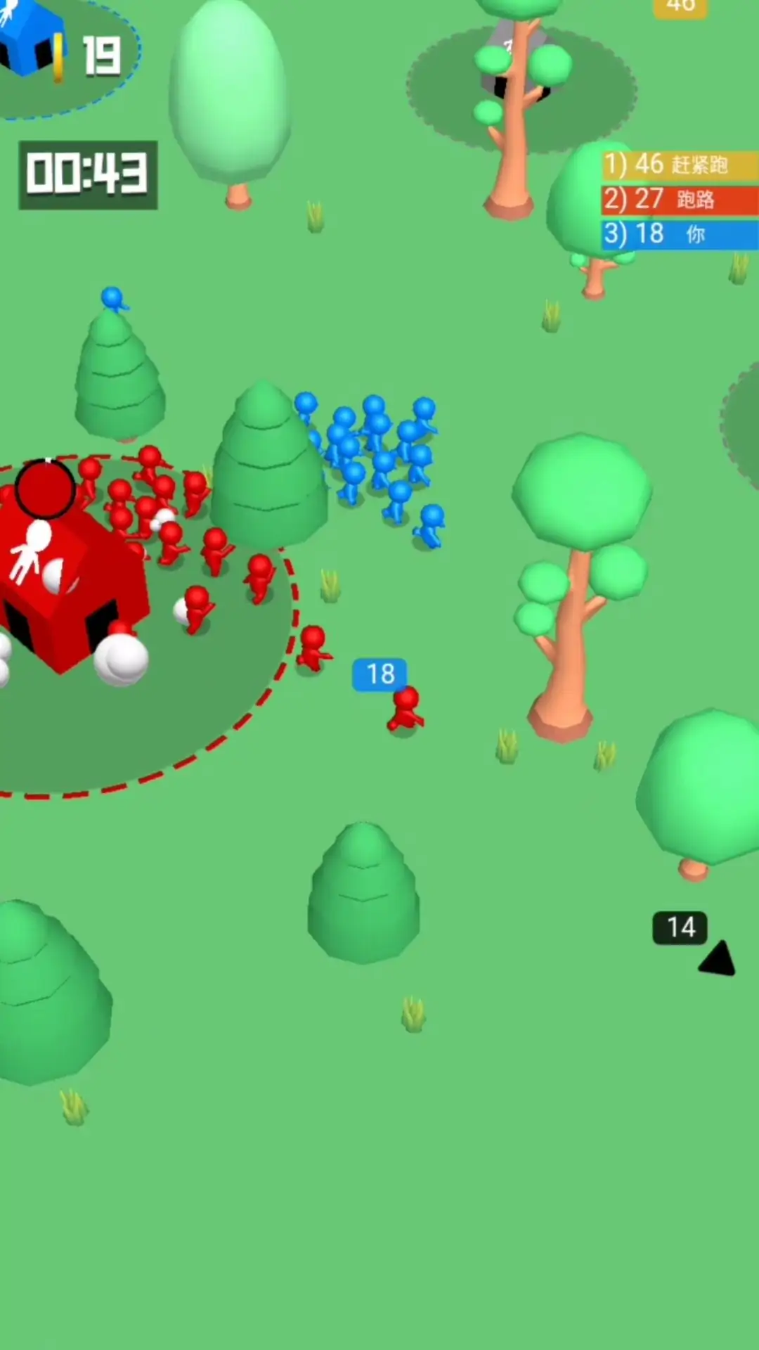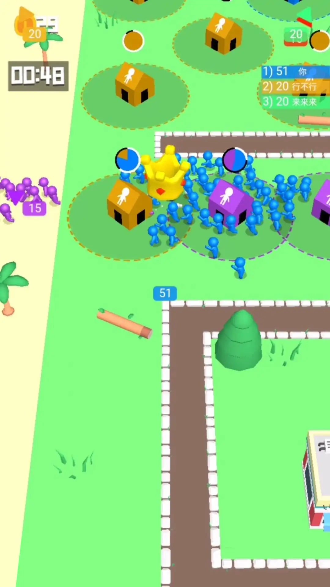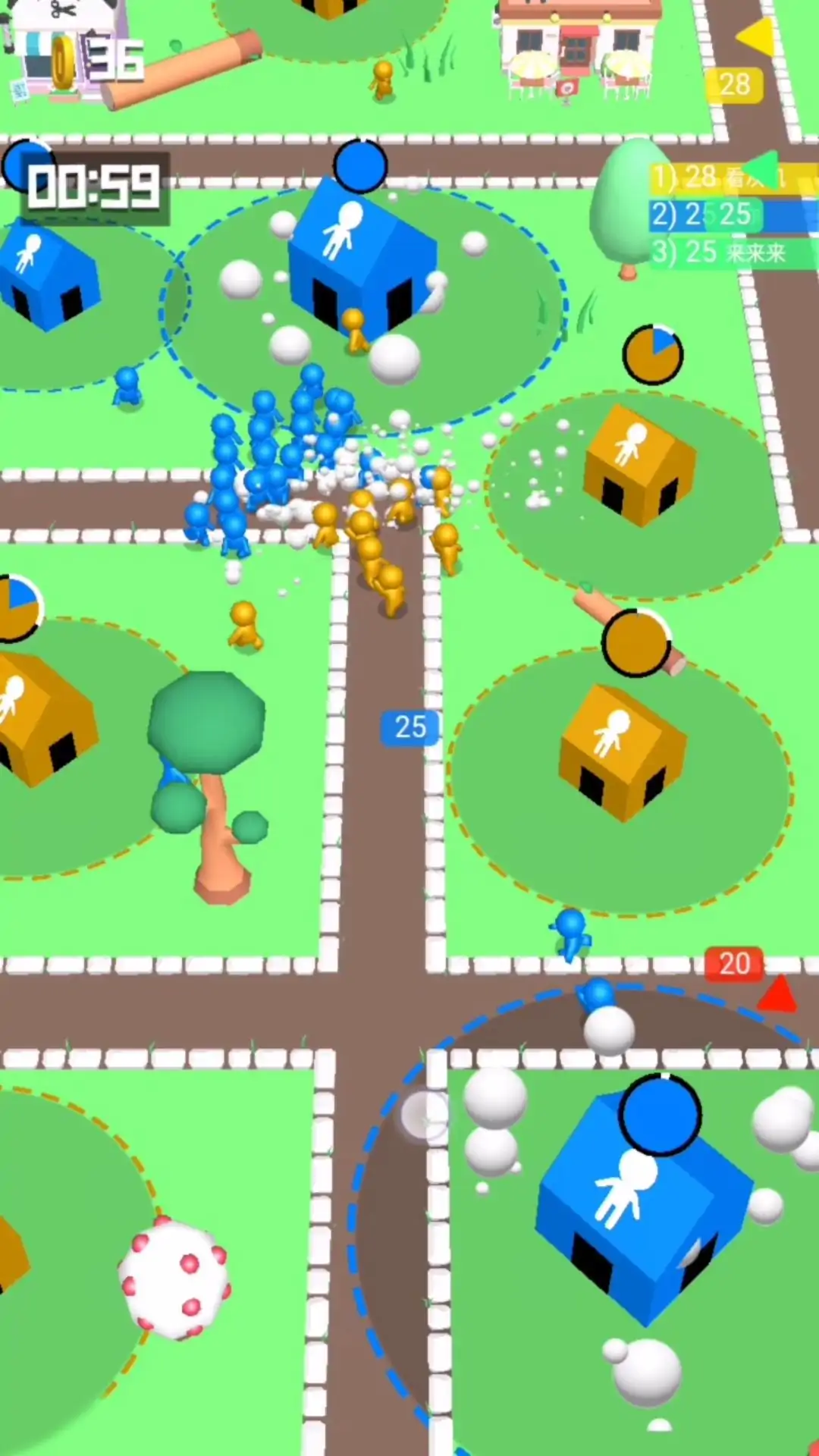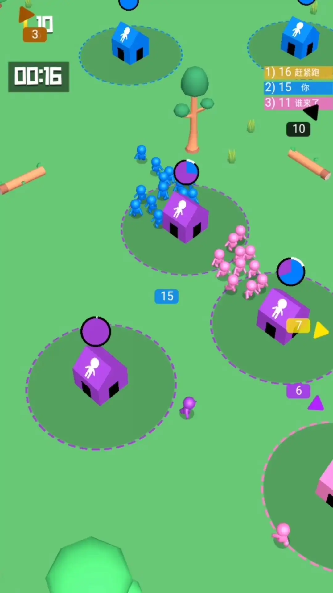 玩家控制小人,滑动屏幕进行移动,占领空房屋,生产小人来壮大自己的队伍,去击败其他颜色的小人并占领他们的房屋,当敌人占领了我们的房屋,我们可以前往进行抢夺,再次把房屋抢夺回来,击败所有其他颜色的小人赢得游戏胜利。