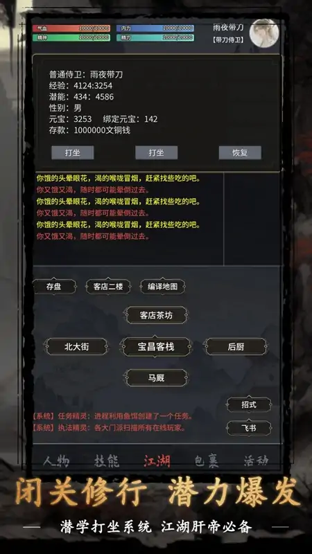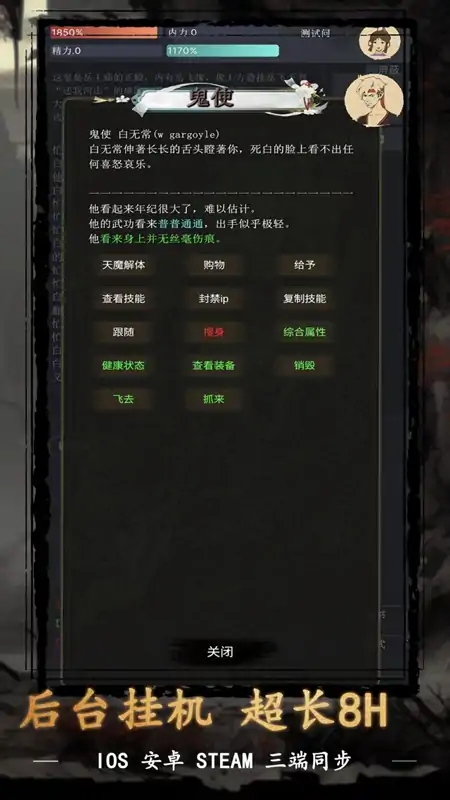 不一样的文字武侠,不一样的武侠mud 游戏开发周期耗时两年半,终于算是画上了一个逗号。我们基于mud框架开发维护,目前客户端内嵌两个版本,一种是熟悉的所谓的换皮mud的指尖APP版本,带有游戏指令玩法。 另外一种是默认的,也是我们持续优化开发两年的无指令版本。 这也是我们的最终目的,我们要做的从来不是mud,而是文字武侠游戏。 游戏独有玩法: 门客系统,帮派pvp城镇掠夺对战系统,宝石系统,意境系统,门派入侵系统,夜间成长刺客系统. 所有版本的数据都是同步的!且我们的安卓结局了文字游戏不能长时间挂机后台的问题,睡觉前挂机练功切换后台安心看小说,睡醒了游戏依旧正常运行!