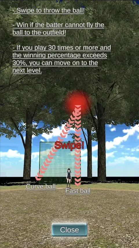 【投球】 ・滑动即可投球! ・如果击球手无法将球飞到外场,则获胜! ・玩30次以上且胜率超过30%即可进入下一关。 【击球】 ・滑动以匹配球的位置来击球! ・将球飞到外场即可获胜! ・玩30次以上且胜率超过30%即可进入下一关
