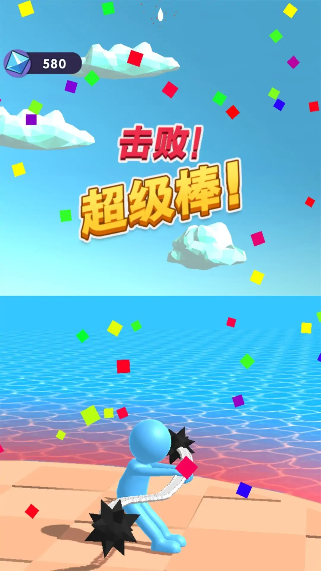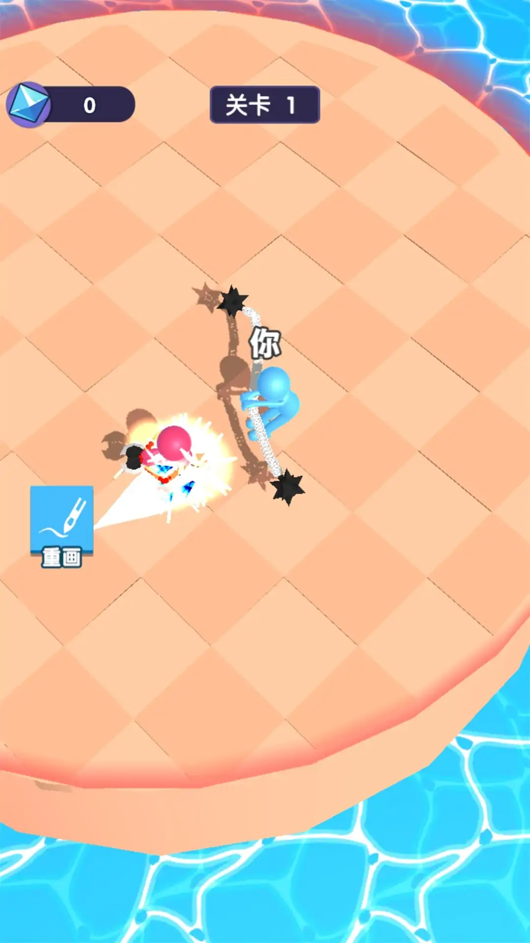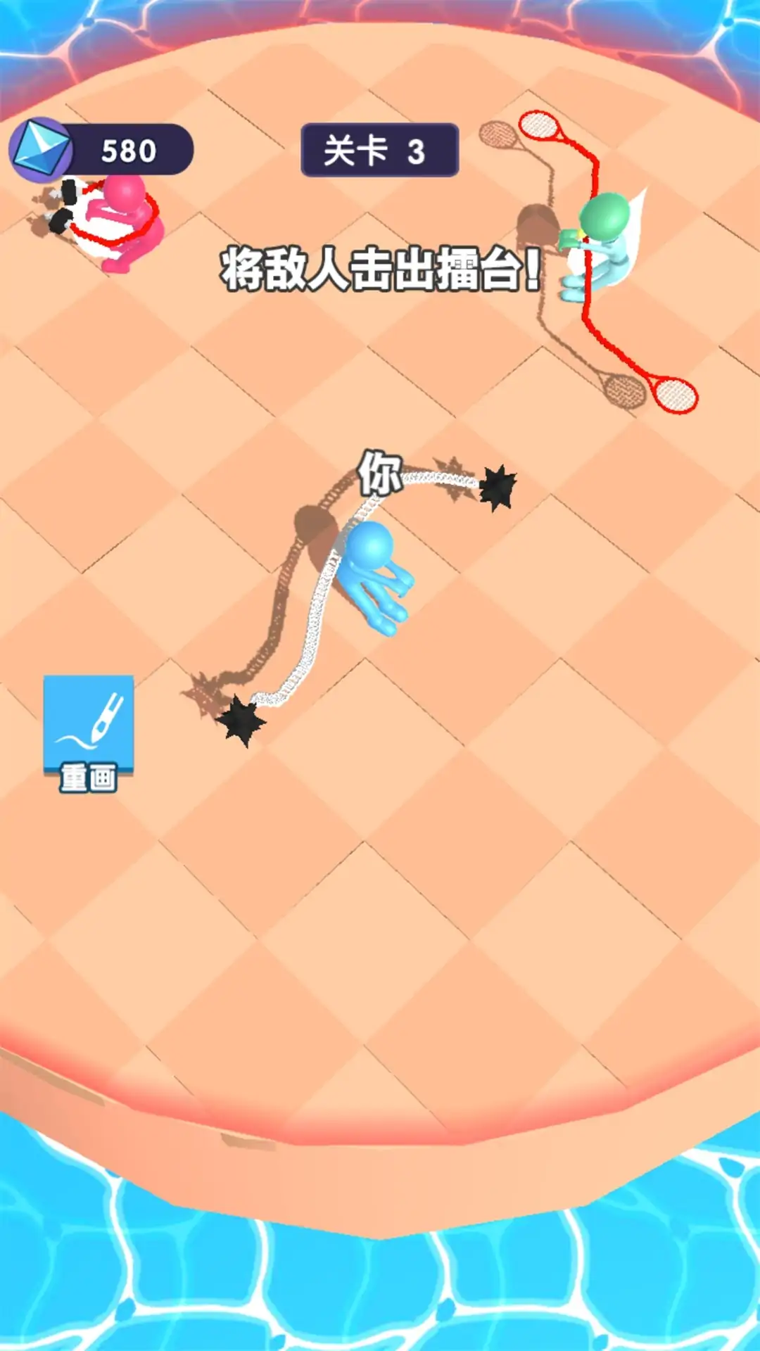 玩家滑动屏幕画出不同形状的武器并操控小人移动,向对手进行攻击,把敌人打出场外会获得游戏的胜利。