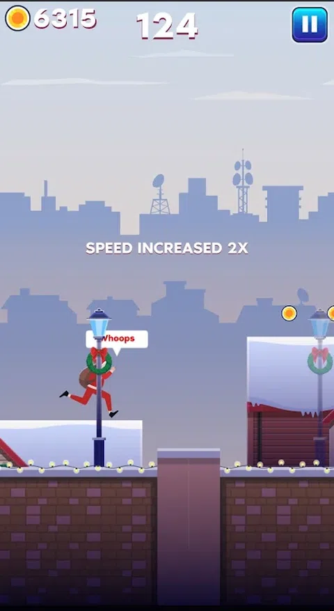 圣诞节之夜,圣诞老人周游世界,为孩子们送礼物。今天,在令人兴奋的新在线游戏圣诞老人跑酷中,您将在这次冒险中帮助他。圣诞老人将出现在您面前的屏幕上,他将沿着房屋的屋顶奔跑,逐渐加快速度。仔细看屏幕。在你的英雄的路上,会有不同高度的障碍,以及不同长度的下坡。你控制你的英雄将不得不跳过所有这些危险。在某些地方,您会看到金币和礼品盒。您将需要拿起所有这些物品。对于他们,您在游戏圣诞老人跑酷中将获得一定数量的积分。 圣诞老人现在通过跑酷送礼物。在这个令人兴奋的全新跑酷游戏中,在积雪的屋顶上跳跃,同时避开障碍物。点击以跳高。感受在空中飞行的冲刺感,然后在着陆时执行生病滚动。通过收集技能卡来解锁不同类型的动作。像圣诞老人一样做各种翻转