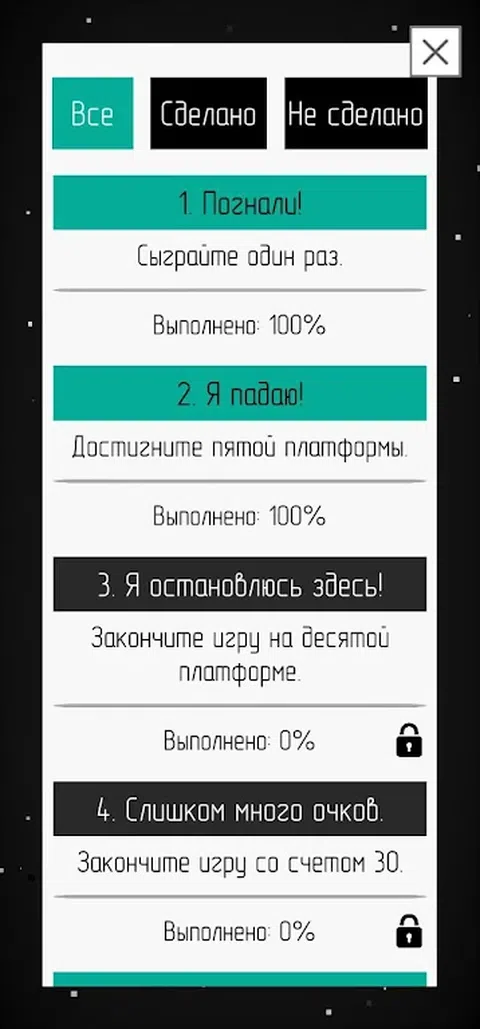 简单而令人上瘾的街机游戏。 你必须从一个平台跳到另一个平台,而当你通过时,平台的速度会增加,平台的宽度会减小。 该游戏具有可让您获得永久奖金的成就。一些成就会给你加分,而另一些会让某些领域更容易完成。 请注意,并非每次击中平台中心都会获得奖励,而只会获得三次奖励(奖励会累积,第三次击中中心会立即获得 3 分)