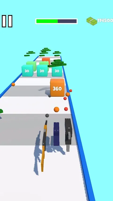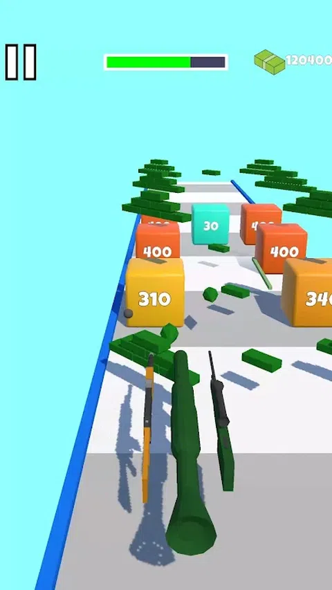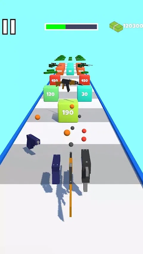 一款具有合并机制的超休闲跑步射击游戏。射击障碍物,收集枪支和金钱。通过将它们合并在一起来升级枪支