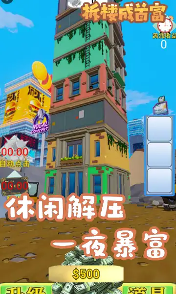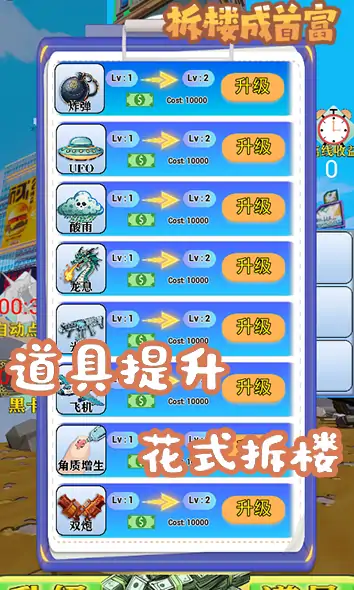 点击拆拆拆!疯狂拆除大楼,赚取大把钞票,使用各种神奇道具,升级你的拆除手指,争做一代拆迁大师,勇夺首富宝座!快来释放你的破坏欲吧!