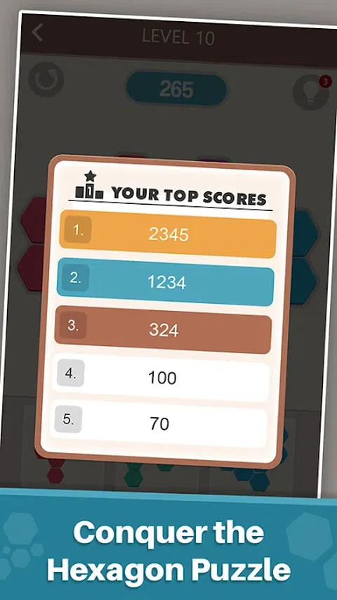 使用 HexDrop 进行令人兴奋和梦幻般的拼图冒险!在这个令人上瘾的六边形益智游戏中体验合并和匹配方块的快感。沉浸在六边形、拼图游戏和匹配元素的世界中,让您着迷。 HexDrop 具有简单明了的用户界面,提供视觉上吸引人的体验。享受华丽的配色方案和特殊效果,为您的游戏增添一丝魔力。规则易于理解,适合所有年龄段的玩家。 在无尽的模式中挑战自己,探索各种级别。测试您的技能,制定行动策略,征服每个难题。利用游戏道具消除更多的方块,争取更高的分数。 HexDrop 提供无缝的游戏体验,无需 Wi-Fi,也没有时间限制。随时随地玩,迷失在这款益智游戏令人上瘾的本质中。 提高您的智慧,拥抱鲜艳的色彩,并潜入 HexDrop 的世界。您能应对挑战并成为终极拼图冠军吗?现在玩,找出答案