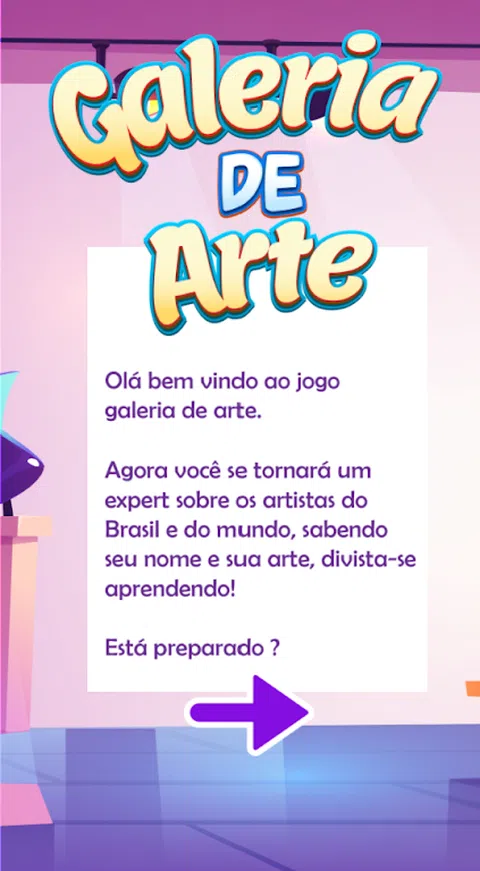 您好,欢迎来到艺术画廊游戏。现在您将成为巴西和世界艺术家的专家,了解他们的名字和他们的艺术,享受学习的乐趣