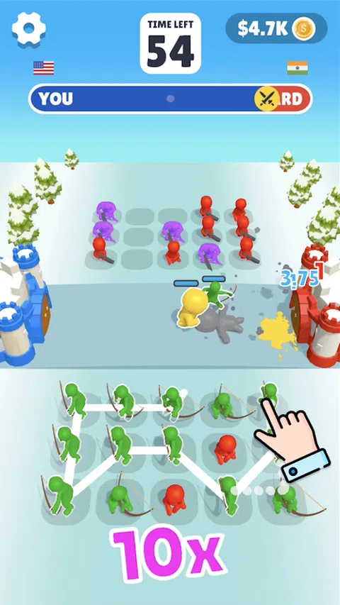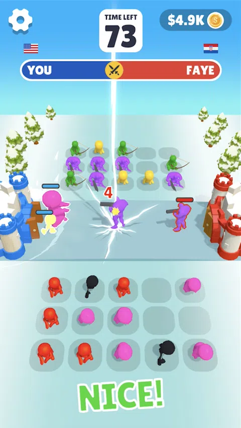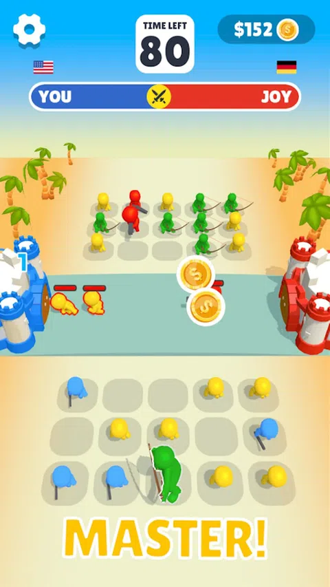 一款令人兴奋的动作益智游戏,您必须在特殊板上连接颜色以创建斗士。组合越好,战士就越强大,越大。收集独特的牌组并粉碎敌人的城堡! 您是在与真人对战,您的任务是在面板上连接战士的 3D 人物。对敌人造成毁灭性打击。更聪明、更快的人将解决难题,他将获胜并占领别人的城堡。 许多世界,来自不同国家的数千名竞争对手,展示了谁更快、更强大、更敏捷。谁拥有更成功的卡牌战士组合,可以变成 3D 角色,每个角色都有自己独特的能力。 很棒的放松游戏不会让您感到无聊,成为军队中最敏捷的国王!完成所有级别并粉碎所有老板