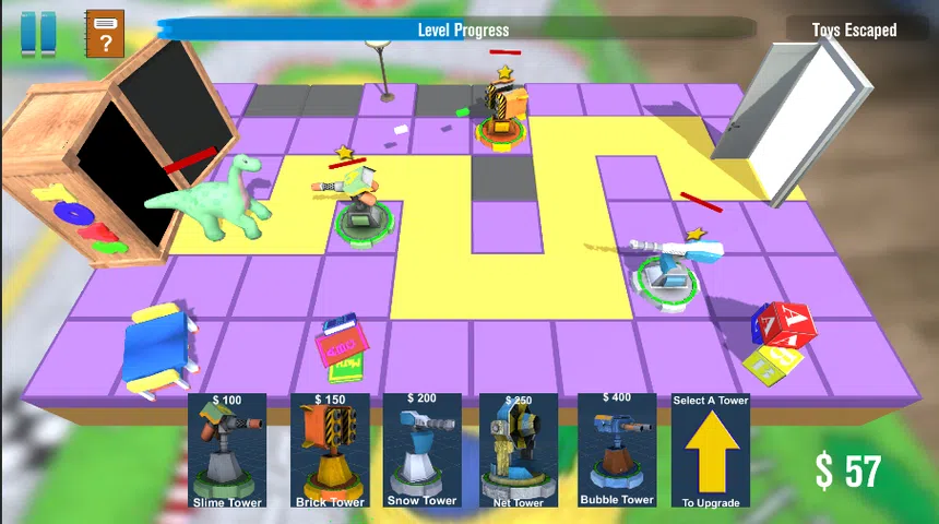 欢迎来到 Toy's Escape,这是一款专为儿童设计的迷人而令人兴奋的益智塔防游戏!潜入一个调皮玩具试图逃离玩具箱的世界,拯救世界取决于你。沿路径战略性地放置塔楼,并挫败玩具的逃生计划! 在 Toy's Escape 中,您的目标是通过战略性地放置各种塔来防止玩具到达门口。每个塔楼都拥有独特的能力,可帮助您完成任务。史莱姆塔的伤害可能很小,但它的粘稠效果会减慢玩具的速度,使它们更容易被捕获。另一方面,网塔不会造成损坏,但会显着减慢玩具的进度,让您有更多时间做出反应。 当心雪球塔!它通过远程攻击造成高额伤害,将行为不端的玩具变成可爱的雪人。砖塔是一股不可忽视的力量,因为它以快速的速度投掷砖块,在中程造成大量伤害,并将玩具变成不可移动的砖墙。如果你喜欢近距离接触,泡泡塔是完美的选择。它会释放大量的泡泡,这些泡泡会扩散开来,将玩具困在肥皂泡的范围内。 随着游戏的进行,玩具会变得越来越狡猾,它们会利用各种技巧和动作来智取您。但是不要害怕!塔可以升级到 25 级,使它们更加强大,更有效地对抗玩具的滑稽动作。增强它们的射程、伤害、速度和其他属性,以增加获胜的机会。 Toy's Escape 不仅仅是阻止玩具;这也是关于捕获它们。当玩具的生命值为零时,它会被捕获而不是被击败。这种对儿童友好的方法可确保玩具不会受到伤害,而只是将其包含在内,从而为年轻玩家提供安全而愉快的体验。 沉浸在 Toy's Escape 迷人而多彩的世界中,其中充满了充满活力的视觉效果和迷人的动画。游戏直观的控制和儿童友好的界面,让所有年龄段的儿童都可以轻松享受。 那么,您准备好迎接保护玩具盒并确保玩具保持原样的挑战了吗?让兴奋在 Toy's Escape 开始 - 终极益智塔防儿童游戏