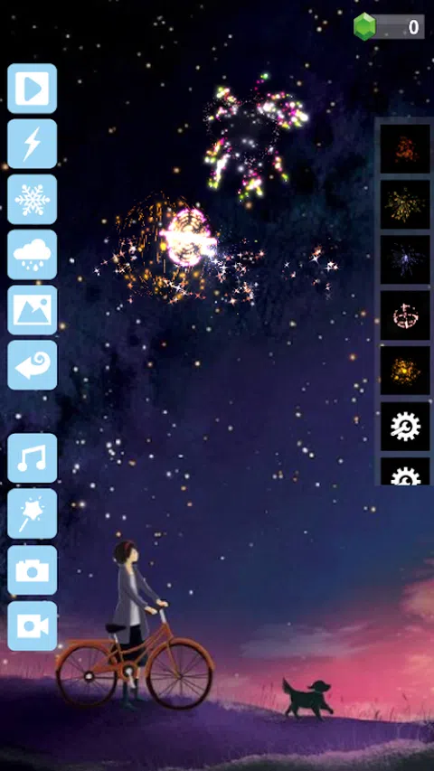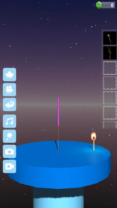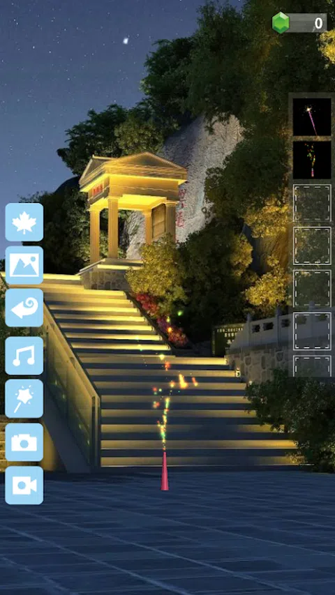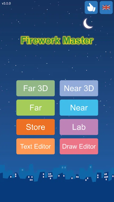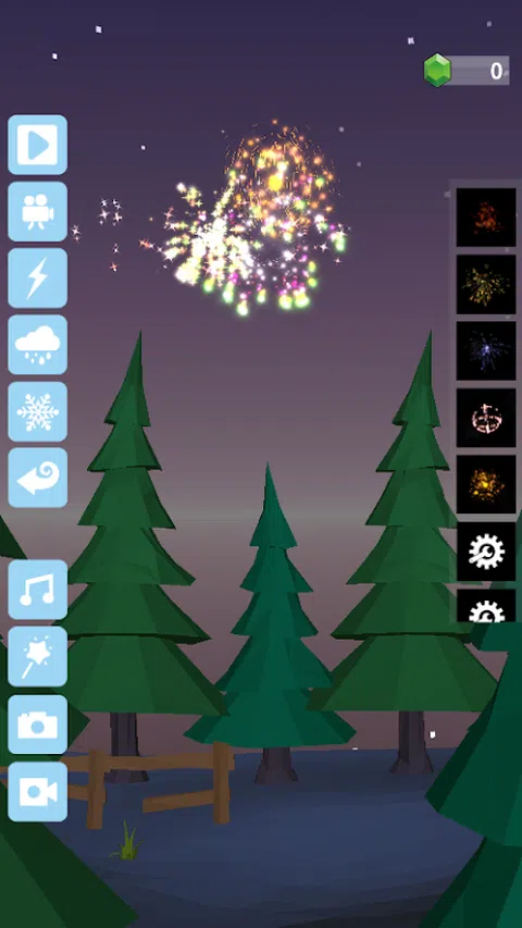 本游戏包含6种模式: 远景模式: 1 顾名思义,在很远的地方观赏烟花 2 烟花秀 3 天气系统,如下雪,下雨等 3D远景模式 3D 场景的远景模式 近景模式: 1 拿在手里放烟花,找回小时候的感觉 2 用火柴点燃烟花 3 有的烟花需要按住不松 3D近景模式 3D场景的近景模式 商店模式: 1 可以选择预设和自定义的烟花并带入到远景和近景场景中 2 可以解锁各种烟花 实验室模式: 1 可以自由组合创造出自己的烟花 2 可以把文字或自己绘制的图案带入到烟花中 文字编辑器模式: 1 可以编辑文字烟花组件 画图模式: 1 可以编辑画图烟花组件