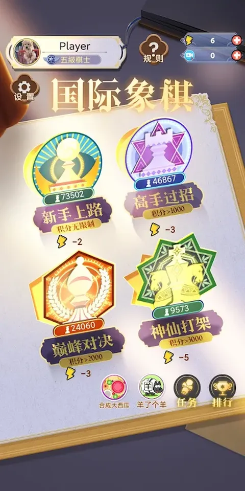 【游戏特色】 1、经典棋类,游戏还原国际象棋,移动端也能畅快体验! 2、通过战胜对手不断获得积分提升等级,成为国际象棋中的王者!