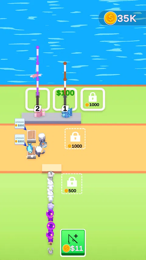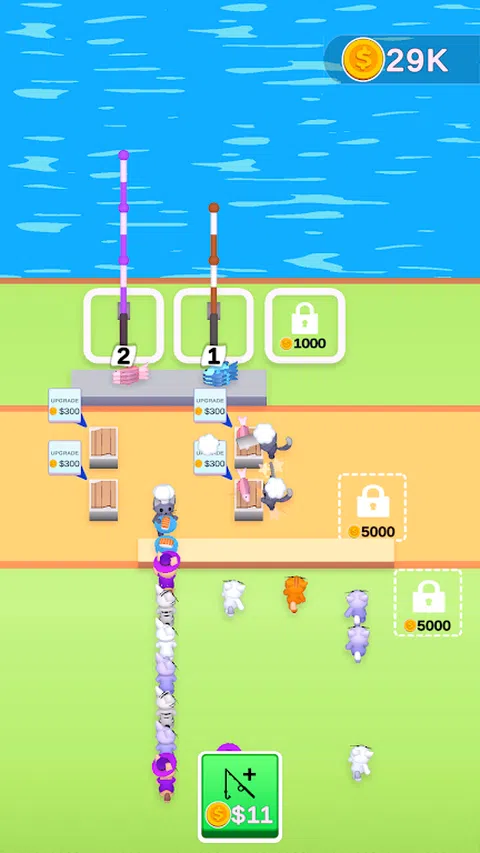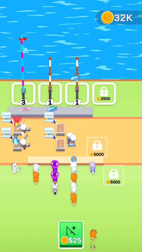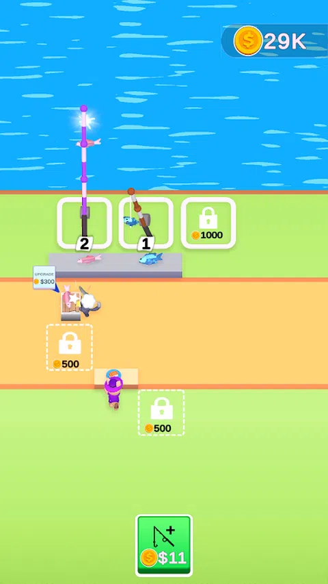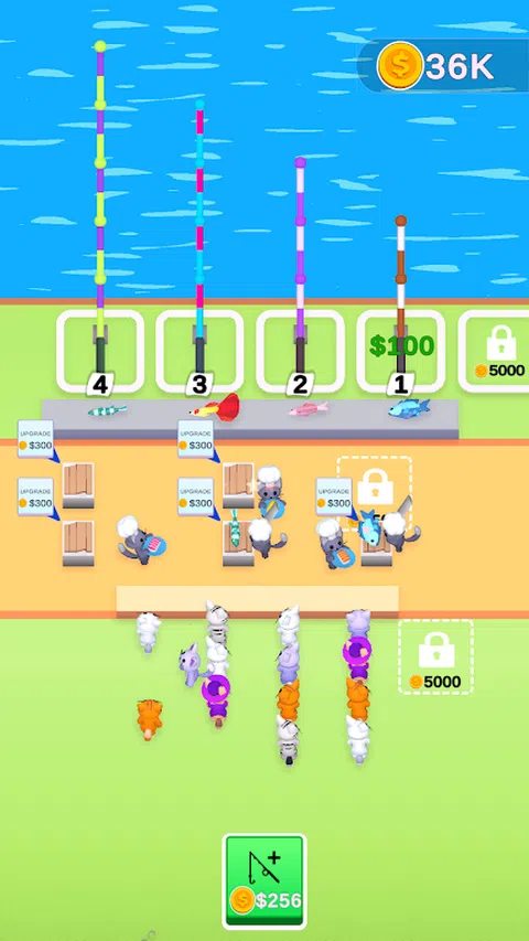 合并钓鱼竿以捕捉更大更好的鱼,解锁并升级厨师以更快地制作寿司,并喂猫