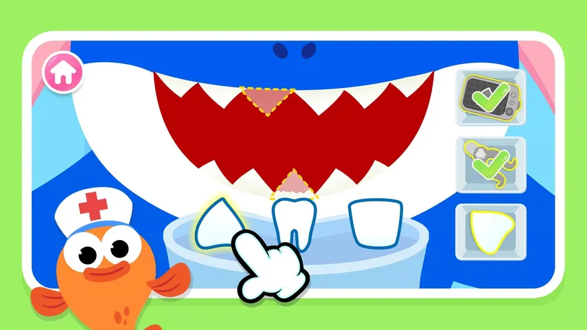 欢迎来到鲨鱼宝宝口腔诊所! 鲨鱼宝宝医生帮你治疗牙齿,牙齿亮晶晶! 下载应用,感受充满趣味的小牙医角色扮演! 鲨鱼一家来口腔检查了! 让我们一起来治疗鲨鱼妈妈肿胀的牙龈。 嘟嘟!清除顽固的牙垢, 再涂上一些药膏舒缓牙龈。 鲨鱼奶奶该换假牙了! 是选闪闪发光的宝石假牙?还是选锋利坚固的鲨鱼牙假牙呢? 让我们看看哪种更适合她! 迫不及待想看到鲨鱼奶奶迷人的笑容啦! 不好,还有好多病人都牙痛呢! 捕蝇草的下颚脱臼了! 快拍个X光检查一下! 温柔地抚摸下颚,给病人温暖舒适的治疗! 河马腐烂的牙齿都发臭了! 用钻头去除腐烂部分,洗净腐烂的碎片! 用可爱的新牙冠覆盖蛀牙! 海象的尖牙断了! 拍个X光看看具体情况! 给海象镶一颗新的牙!大功告成! 现在它又可以享受美味的蛤蜊了! 和鲨鱼宝宝一起成为儿童牙医,治疗各种动物病人! 通过12个有趣的治疗场景,让孩子们学习如何更好地保护牙齿! 有了鲨鱼宝宝的陪伴,孩子们再也不怕去牙科做检查啦! - 添加游戏和学习- 体验Pinkfong独特拥有的专业知识的优质儿童会员服务