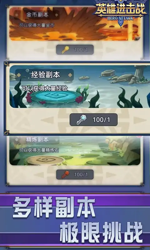 《英雄进击战》是一款放置类RPG游戏,玩家将踏上一段充满冒险和策略的旅程,积累力量并与其他英雄角逐。在这个广阔的奇幻世界中,玩家将体验多种多样的独特玩法,开启属于自己的英雄传说。 【游戏玩法】 分解与升级: 玩家可以通过冒险获得各种装备,之后将其分解为精炼石。收集到的精炼石可以用来升级装备,提升战斗力与属性,让您在战斗中更加无敌。 伙伴系统: 玩家可以携带最多四个伙伴与自己并肩作战。每个伙伴都有独特的技能,搭配不同伙伴将产生不同的战术效果,合理利用伙伴的能力,有助于在战斗中获得优势。 装备系统: 装备分为普通装备和套装装备。套装装备具备独一无二的属性,能够为角色提供更强大的增益效果,合理搭配装备将是通往胜利的关键。 副本玩法: 通过多种副本任务,玩家不仅可以收集资源,还能争取丰厚的奖励。越高难度的副本,挑战性越大,但收获也将更加丰厚。 竞技系统: 与其他英雄进行竞技。在竞技场中展示您的战斗策略和实力,争夺荣耀与丰厚的奖励。谁才是最强的英雄?这就看你的实力了! 副本探险: 进行副本挑战,玩家可以获得强力宝石和装备,将这些宝石嵌入装备中,以提升其属性和战斗效果。深入副本,探索隐藏的宝藏与强敌,发现更多惊喜! 在这里,您不仅可以享受轻松的放置玩法,还能体验深度的策略搭配。无论是强大的装备系统,独特的伙伴技能,还是激烈的对战,这一切都将在您的指尖绽放出无尽的可能性。快来加入我们,成为最强的传奇英雄吧!