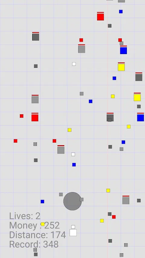 您玩一个白色方块,必须防御彩色方块军队。当触摸屏幕时,将出现用于移动的“操纵杆”,并且每隔一段时间会自动发射子弹。 在躲避敌人子弹的同时尝试并获得尽可能远的距离。当然,不同的敌人会以不同的方式攻击。 为了承受它们不断增加的数量,您必须在商店中升级自己或获得一些宠物帮助。 还有成就等着你