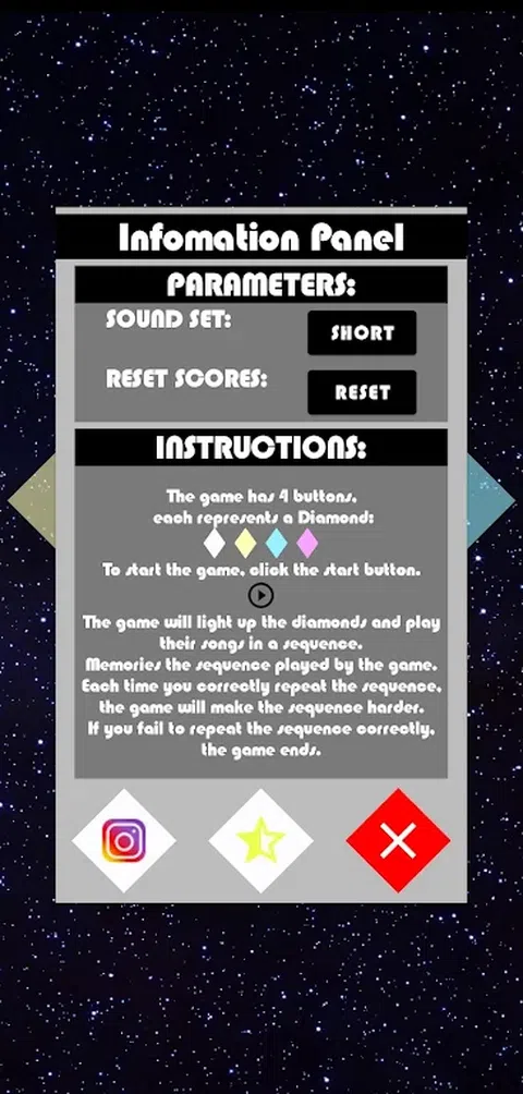 “钻石说”或“钻石权威说”,这是一款挑战记忆的游戏,灵感来自 80 年代著名的“西蒙说”游戏。 保持警惕并记住哪些按钮会亮起并播放音符,并尝试按照给定的顺序重复播放。 每次你答对时,随着时间延长,重播序列;并挑战自己,直到你的记忆力不再允许为止