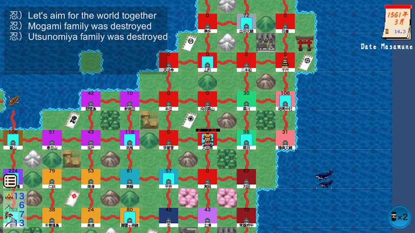 △▼ 用间隙时间统一世界△▼ 让42位战国大名攻占113座城堡吧! ! 只需要几分钟就能统一全国! !超休闲! ! 这是一场战斗,这是一场战斗,这是一场战斗! ! 什么? “人民幸福吗?”尽快统一世界,会更加和平。 走~足轻,枪兵队,骑兵队,炮兵队! !哎呀忍,我不该忘记你的。查看敌方城堡的部队! ! 利用敌方士兵的弱点! !这是一系列的连胜! !让我们一起前进吧! ! 从、武田信玄、上杉谦信等著名大名到传说中的弱大名,与所有大名一起以称霸全国为目标! 最短的通关时间将保留在记录中,并以自己的最短记录为目标。 清除所有大名是相当困难的! 操作非常简单! !让我们用一只手通过点击和轻拂来操作著名的大名。 点击即可更改部队类型,只需按一下按钮即可召唤忍! ! 首先,让我们从一位拥有高兵力的著名大名来感受一下游戏吧! ! 本作是一款以战国时期为背景的解谜风格模拟游戏。敌人不进攻,捕获时少不了一点计算,因此非常适合脑筋急转弯。这是一个简单但战略性的规范,只追求领土扩张,纯粹在战斗中放弃城堡,省略所有内政和外交。 我们期待您的挑战